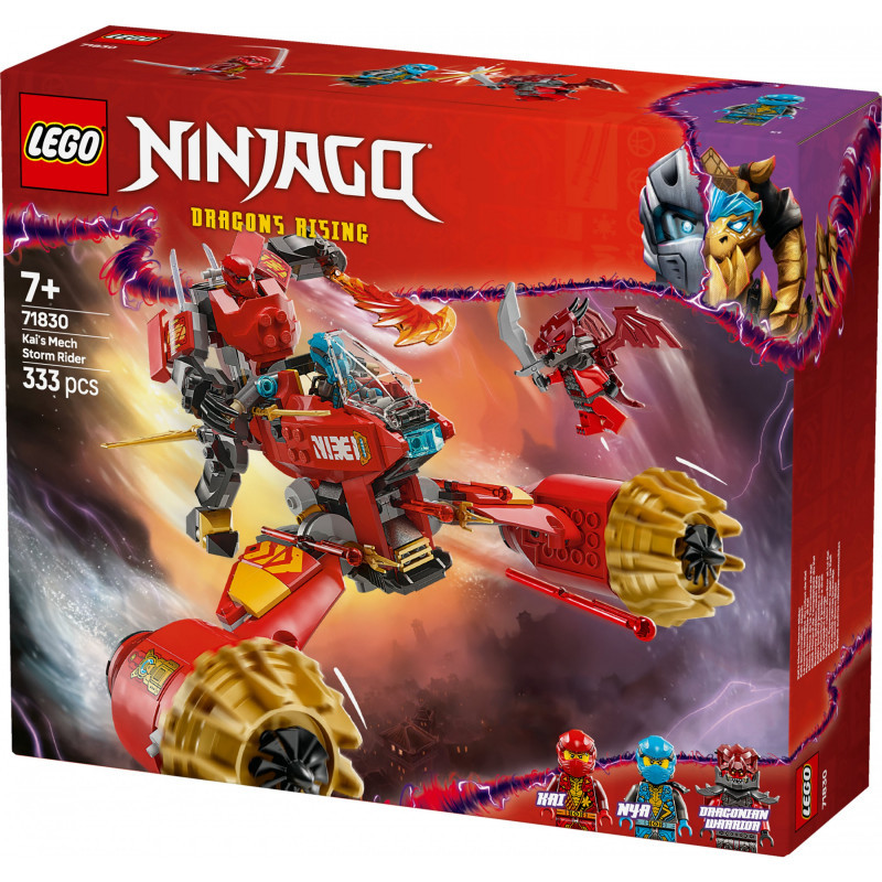 "LEGO NINJAGO Kai's Mech Storm Rider. Product type: Building set, Recommended age (min): 7 yr(s), Material: Plastic, Number of pieces: 333 pc(s). Package weight: 556 g"\n"Kai’s Mech Storm Rider (71830) combo ninja toy lets boys and girls aged 7 and over recreate exhilarating scenes from season 3 of the NINJAGO® Dragons Rising TV show. Kids can play with the large action toy before they separate it into 2 smaller vehicles: Kai’s mech with posable head, arms and legs, a cockpit and a large storm blade accessory, and Nya’s flying motorbike toy with a cockpit, movable wings and 2 spring-loaded shooters.