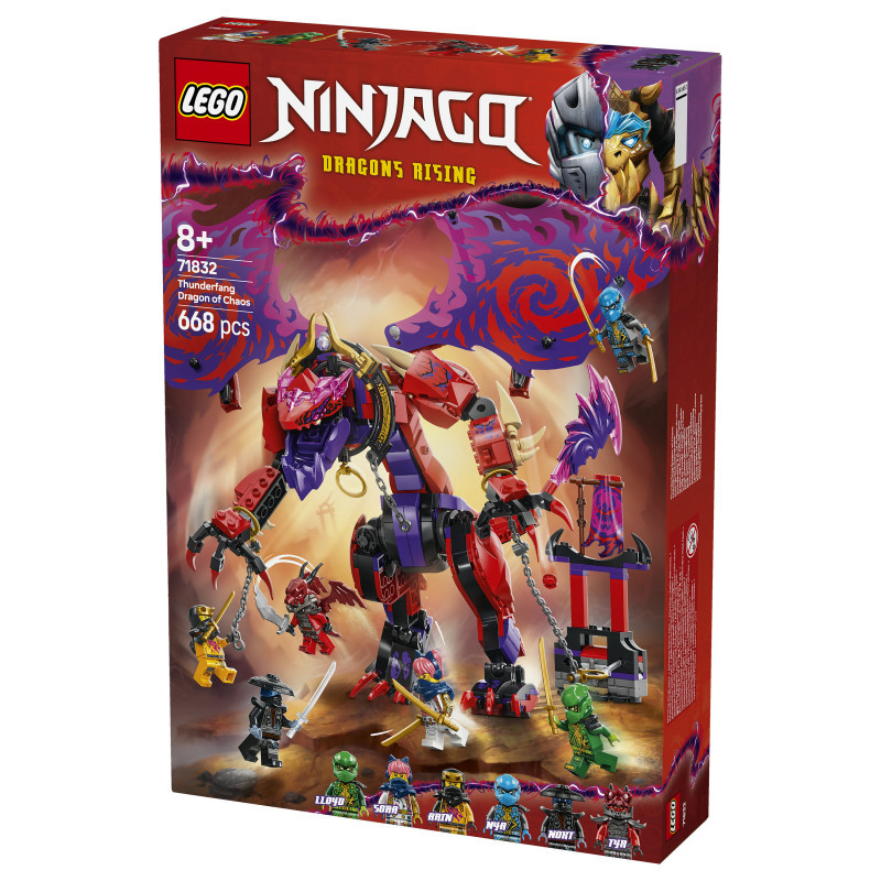 "LEGO NINJAGO Thunderfang Dragon of Chaos. Product type: Building set, Recommended age (min): 8 yr(s), Material: Plastic, Number of pieces: 668 pc(s). Package weight: 809 g"\n"The LEGO® NINJAGO® Thunderfang Dragon of Chaos (71832) ninja toy lets boys and girls aged 8 plus recreate thrilling action from season 3 of the NINJAGO Dragons Rising TV show. This building set for kids features a large dragon toy with a posable tail, legs, wings, feet, head and jaw, and a stud shooter under each wing. The dragon figure is chained to a small side build and can be released by unlocking it with 2 prismatic blade accessories.