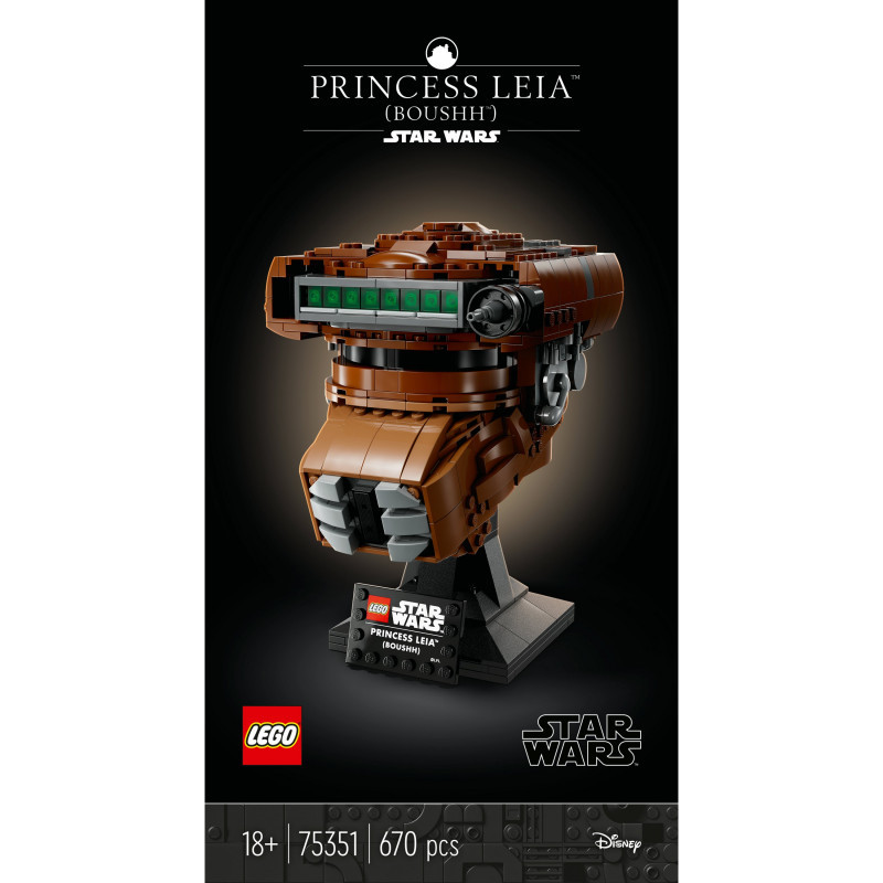 "LEGO Star Wars Princess Leia™ (Boushh™) Helmet. Product type: Building set, Recommended age (min): 18 yr(s), Material: Plastic, Number of pieces: 670 pc(s). Package weight: 870 g"\n"Pay homage to a legendary character with this LEGO® Star Wars™ Princess Leia (Boushh) Helmet (75351) build-and-display model for adults. Channel your creative Force to recreate the bounty hunter helmet worn by Princess Leia as a disguise to enter Jabba the Hutt’s palace in Star Wars: Return of the Jedi. A buildable stand with a nameplate completes an admirable centrepiece.
