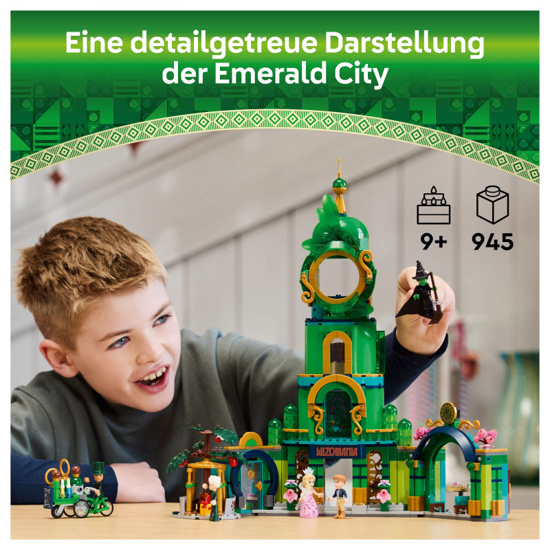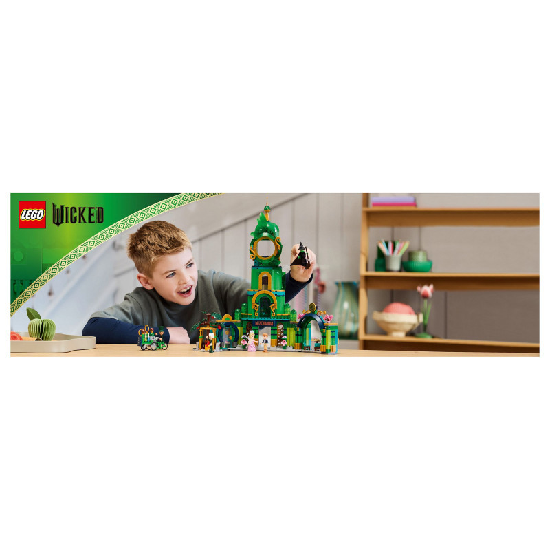 "LEGO Welcome to Emerald City. Product type: Building set, Recommended age (min): 9 yr(s), Material: Plastic, Number of pieces: 945 pc(s). Package weight: 1.32 kg"\n"Take kids aged 9 and over on a magical LEGO® adventure to the land of Oz with the Welcome to Emerald City (75684) collectible toy. Young builders recreate scenes from the Wicked film as they build this detailed 3-storey tower toy and explore the model’s many features.