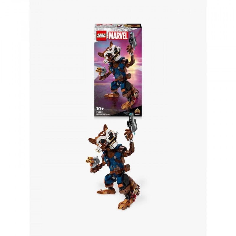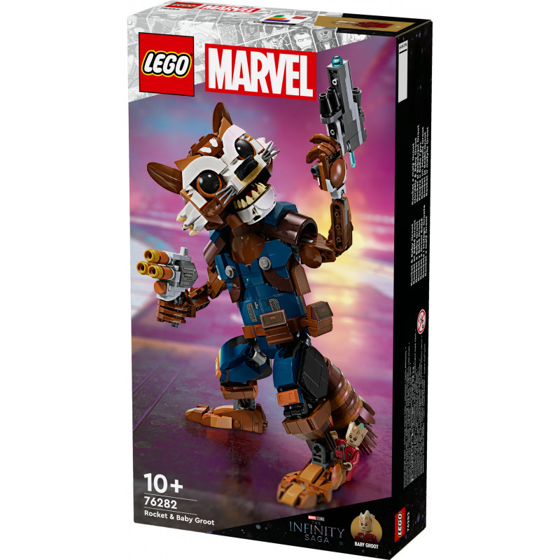 "LEGO Rocket & Baby Groot. Product type: Building set, Recommended age (min): 10 yr(s), Material: Plastic, Number of pieces: 566 pc(s). Package weight: 554 g"\n"Take Marvel film action to the next level with LEGO® Marvel Rocket & Baby Groot (76282). This buildable toy for boys and girls aged 10+ is jointed, authentically detailed and stands over 22 cm (8.5 in.) tall. More than just a kids' construction toy, this Rocket action figure is a realistic recreation of an iconic character from Marvel Studios’ Guardians of the Galaxy.