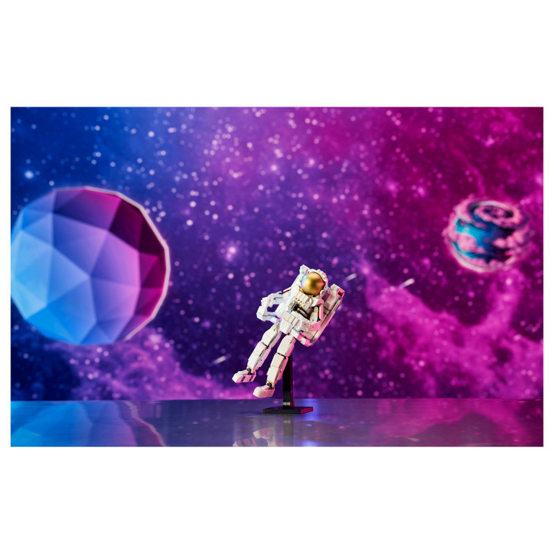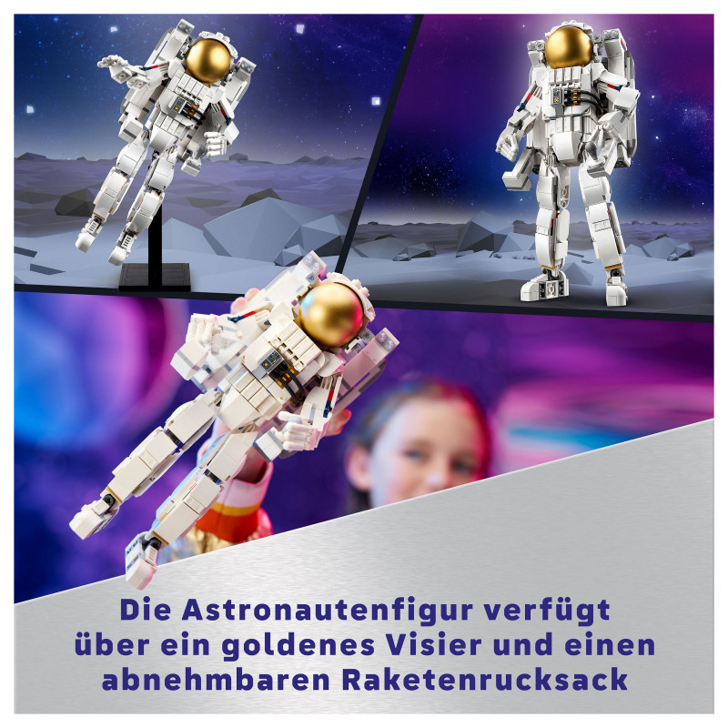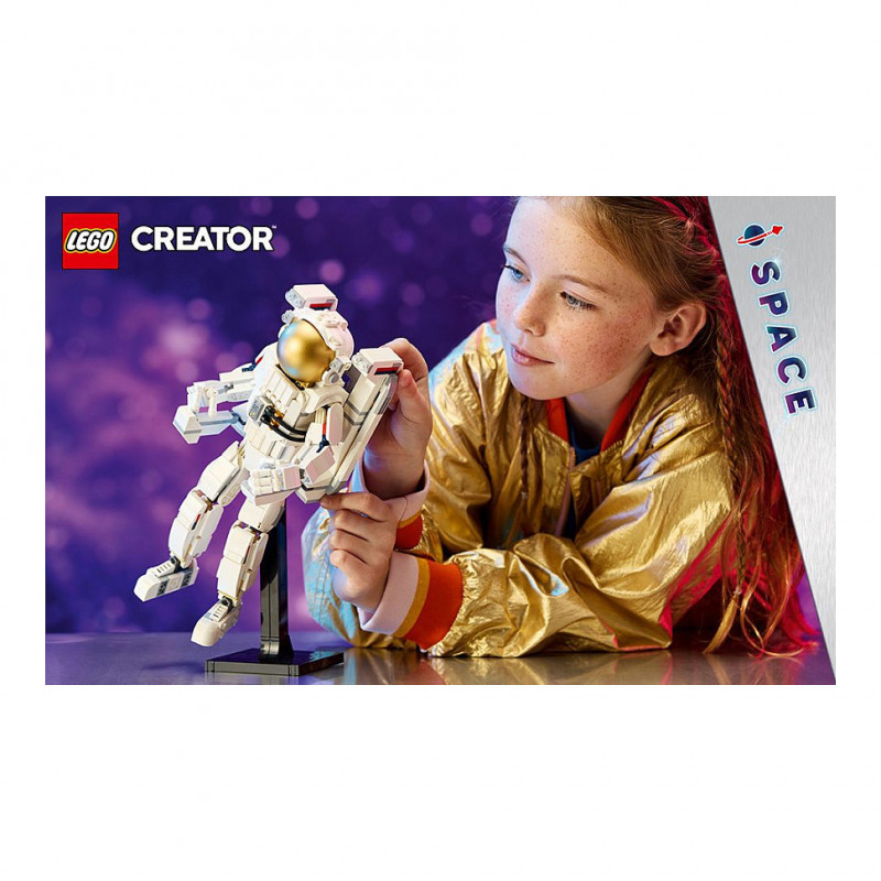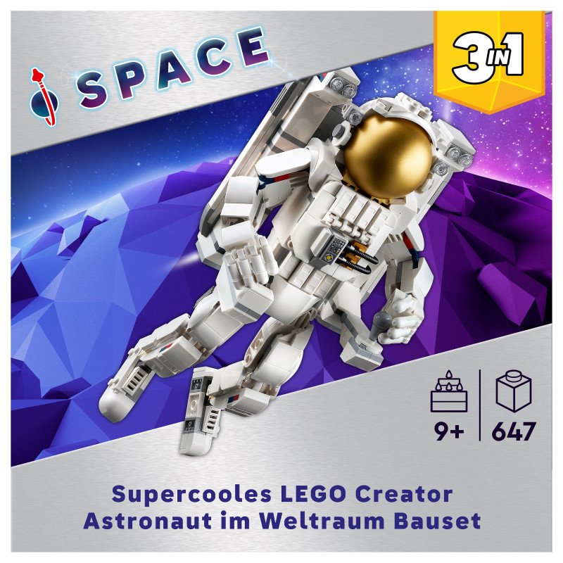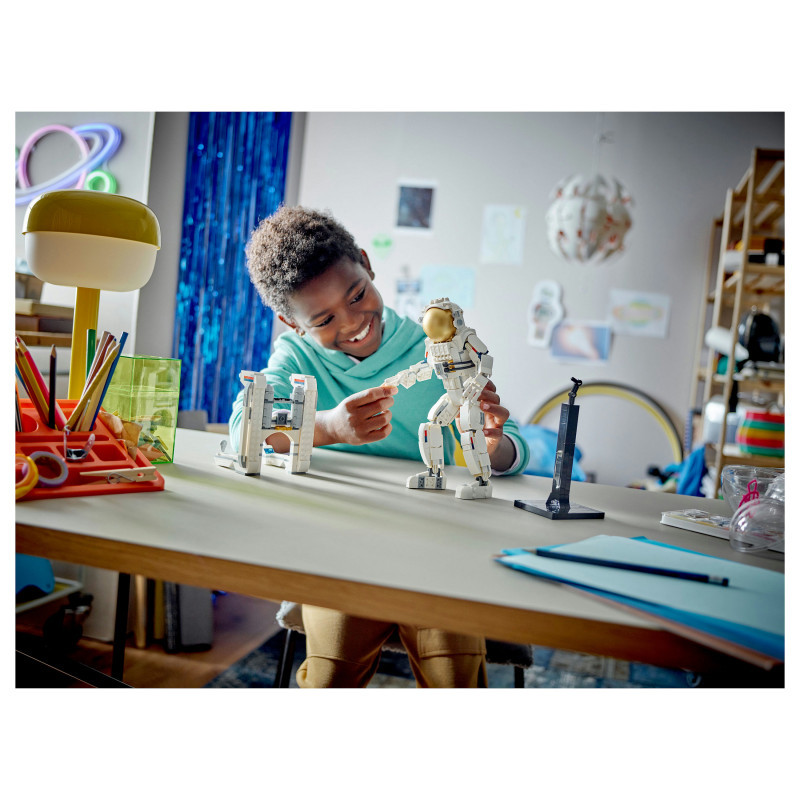 "LEGO Creator Space Astronaut. Product type: Building set, Recommended age (min): 9 yr(s), Material: Plastic, Number of pieces: 647 pc(s). Package weight: 942 g"\n"LEGO® fans aged 9+ can blast into space to explore new planets by recreating space adventures with this LEGO Creator Space Astronaut (31152) building toy. The astronaut figure includes a detachable jet propulsion backpack, posable legs, feet, arms and fingers and a golden opening visor with a seat inside for a minifigure (not included).