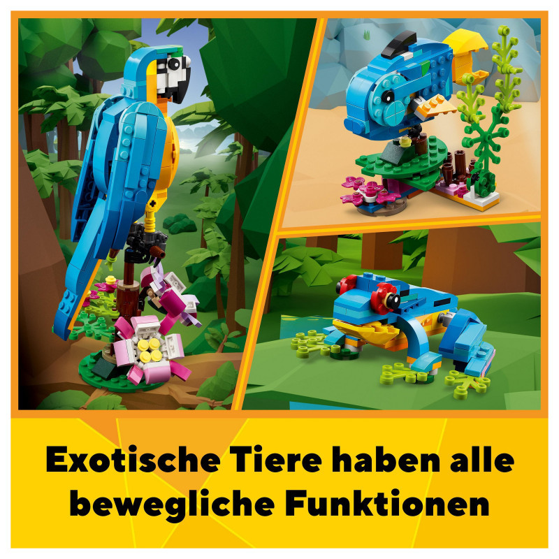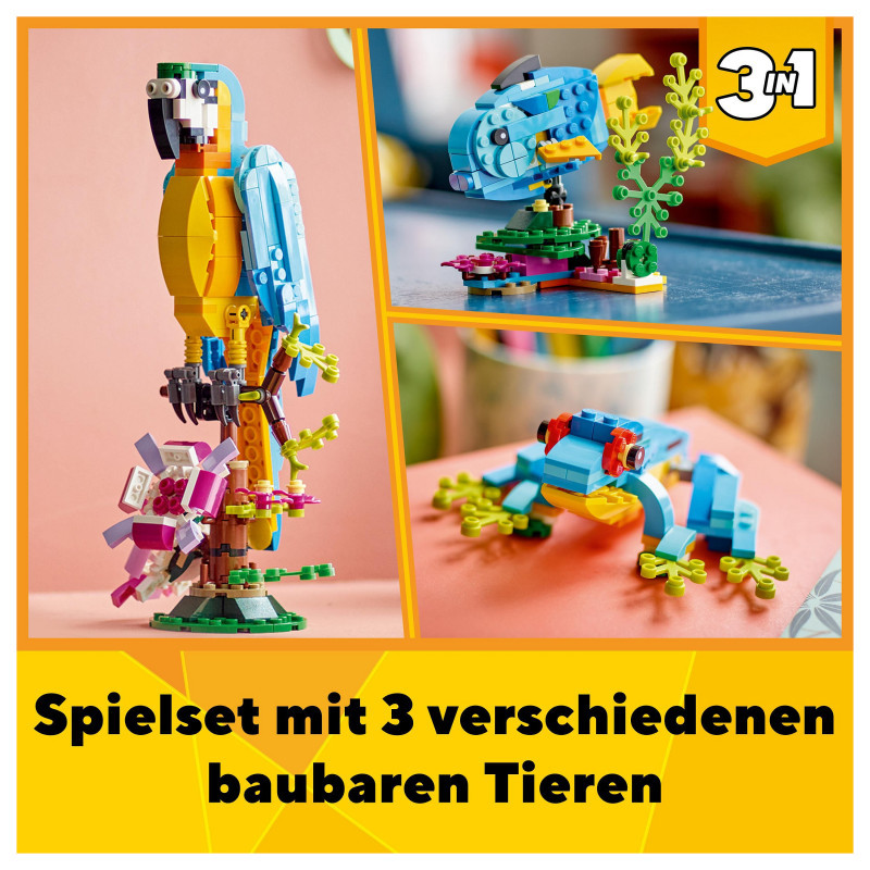 3in1 exotic animal toys – Kids aged 7+ can step into a rainforest with the LEGO® Creator 3in1 Exotic Parrot (31136) playset, featuring a parrot, a fish and a frog