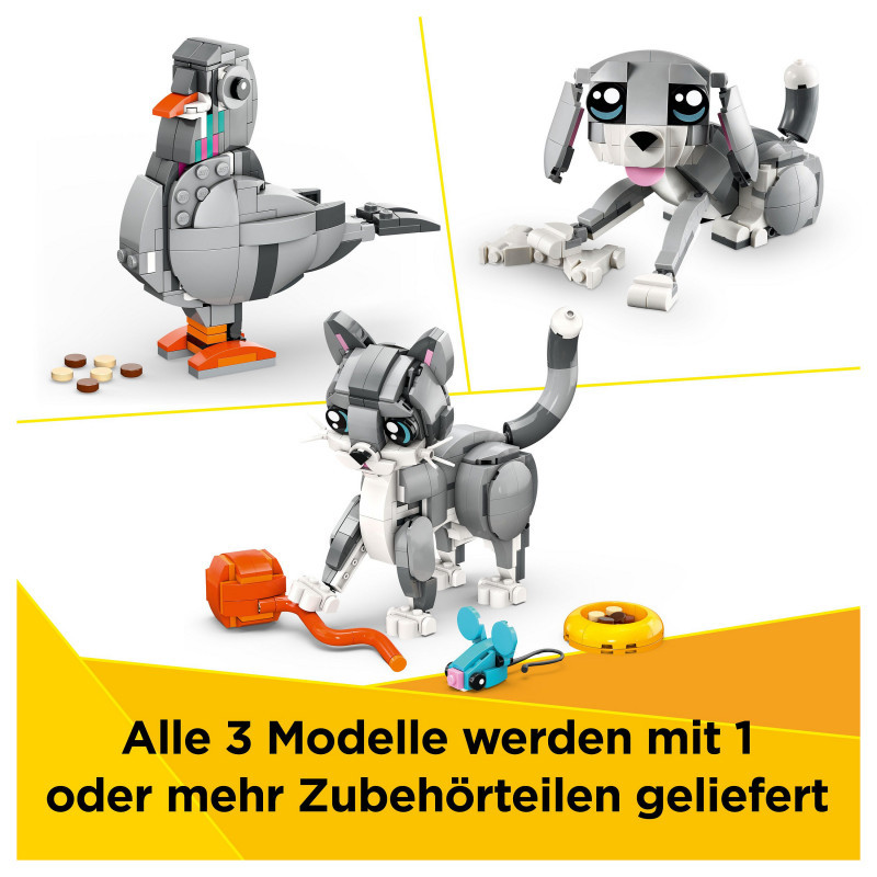 Endless animal play options – Kids can choose exciting adventures with 3 different pet sets (models cannot be built simultaneously): a Playful Cat toy, a cheerful dog toy and a curious pigeon toy