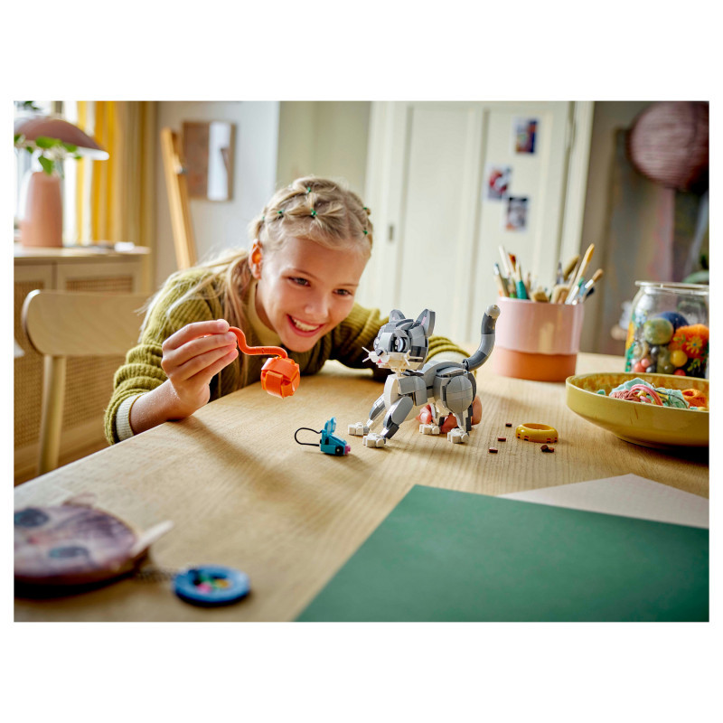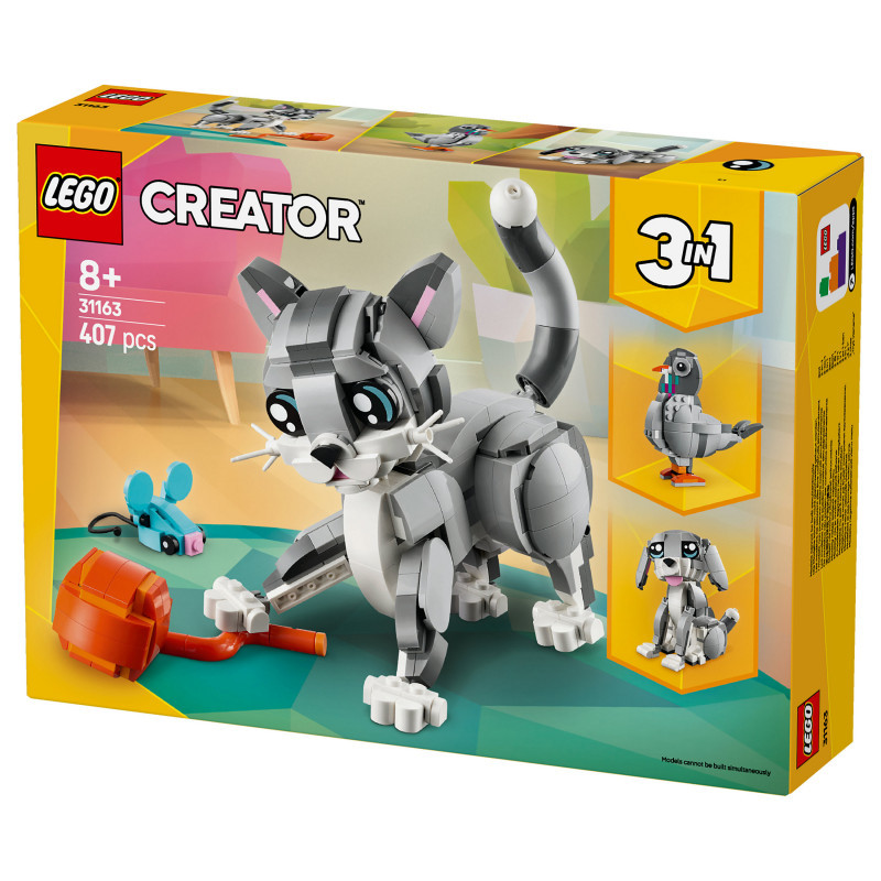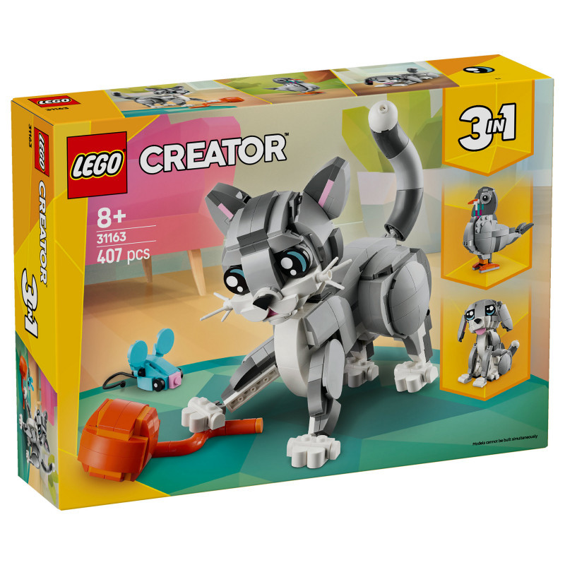 "LEGO Creator Playful Cat. Product type: Building set, Recommended age (min): 8 yr(s), Material: Plastic, Number of pieces: 407 pc(s). Package weight: 518 g"\n"Treat pet-lovers aged 8 and over with this adorable LEGO® Creator 3in1 Playful Cat (31163) building set. The pet toy set features a cute cat toy with a posable head, ears, tail and legs, and accessories including a food bowl, toy mouse and ball of yarn, so kids can play out fun-filled stories.