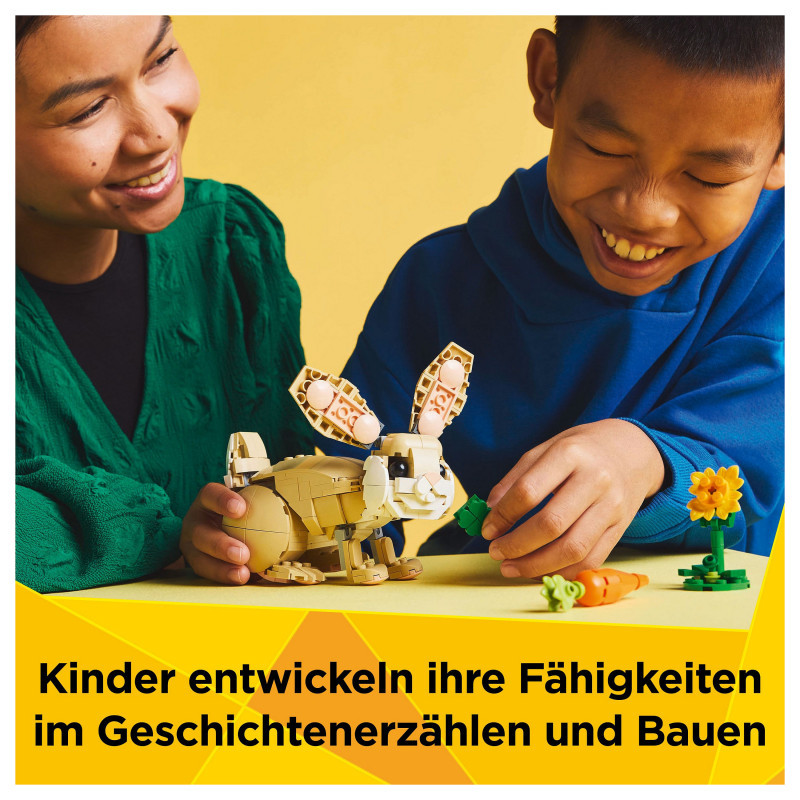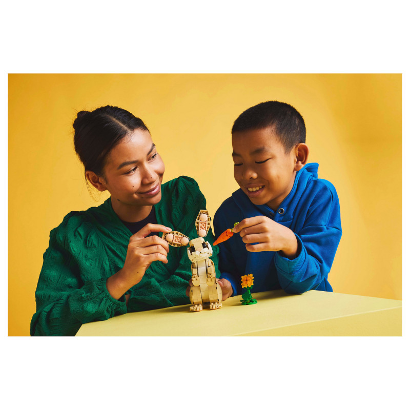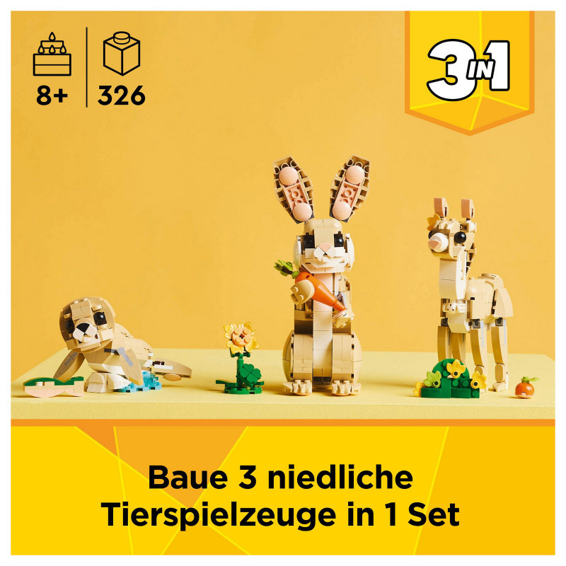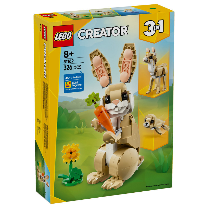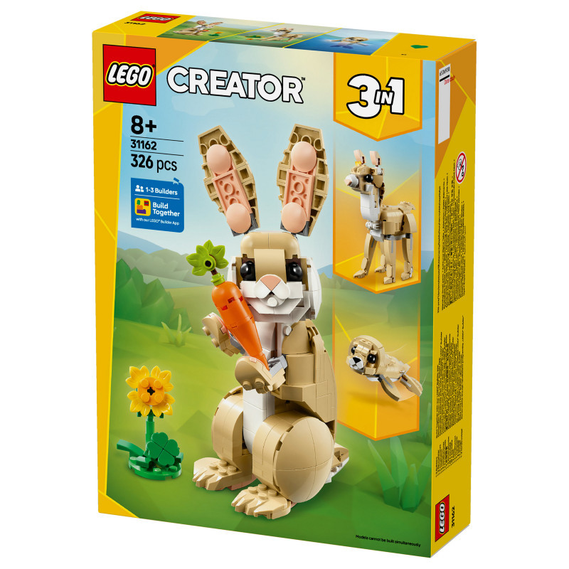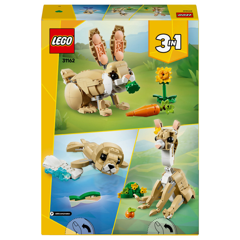 "LEGO Creator Cute Bunny. Product type: Building set, Recommended age (min): 8 yr(s), Material: Plastic, Number of pieces: 326 pc(s). Package weight: 432 g"\n"Let animal-loving kids aged 8 and over enjoy fun adventures with this LEGO® Creator 3in1 Cute Bunny (31162) building set. The animal playset features a bunny toy for kids with a posable head, ears, forelegs and hindlegs, who can stand on either 2 or 4 legs, and comes with a sunflower and a carrot.