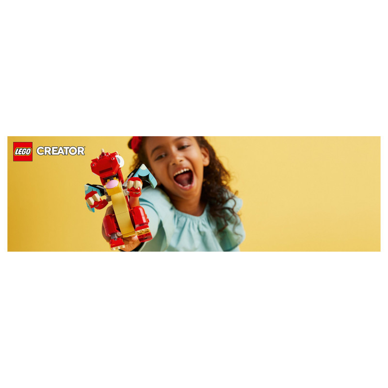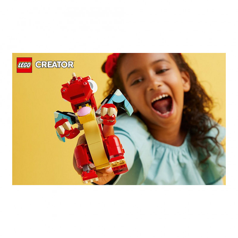 "LEGO Creator Red Dragon. Product type: Building set, Recommended age (min): 6 yr(s), Material: Plastic, Number of pieces: 149 pc(s). Package weight: 185 g"\n"Creative kids aged 6+ can travel to a magical land for fun-filled stories with this 3in1 Red Dragon (31145) animal toy building set. It features a friendly dragon toy, which has big eyes and posable arms, hands, wings, legs, feet, head and mouth, so kids can choose how to use it for playtime adventures and display afterwards.