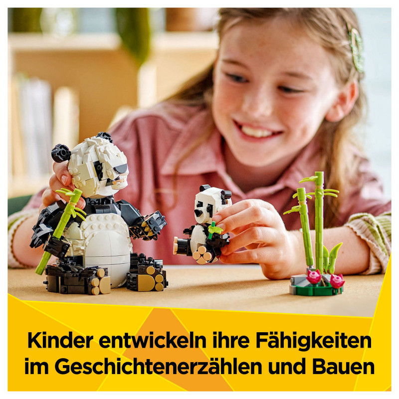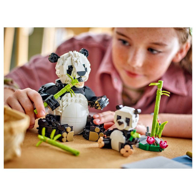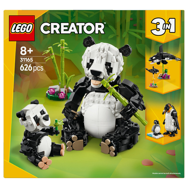 "LEGO Creator Wild Animals: Panda Family. Product type: Building set, Recommended age (min): 8 yr(s), Material: Plastic, Number of pieces: 626 pc(s). Package weight: 814 g"\n"Kids aged 8 plus share in the love and fun of 3 animal families with this Wild Animals: Panda Family (31165) playset. The panda toy features an adult animal with a posable mouth, head, neck and paws, and a cute baby panda accompanied by a bamboo shoot to eat as a snack.