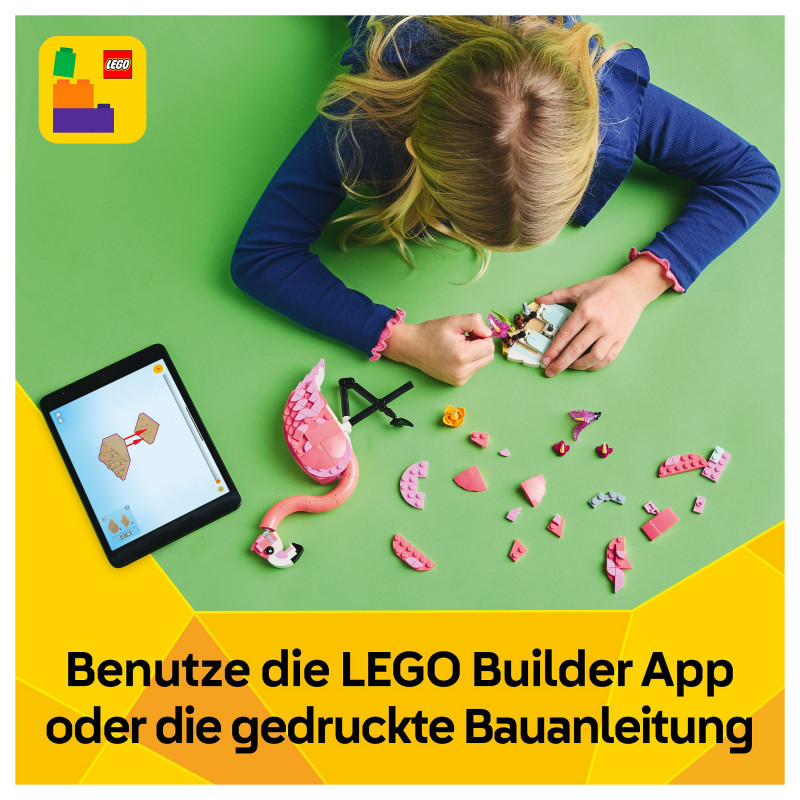 Measurements – This 288-piece LEGO® rebuildable toy set features a pink flamingo toy standing over 23 cm (9 in.) tall"