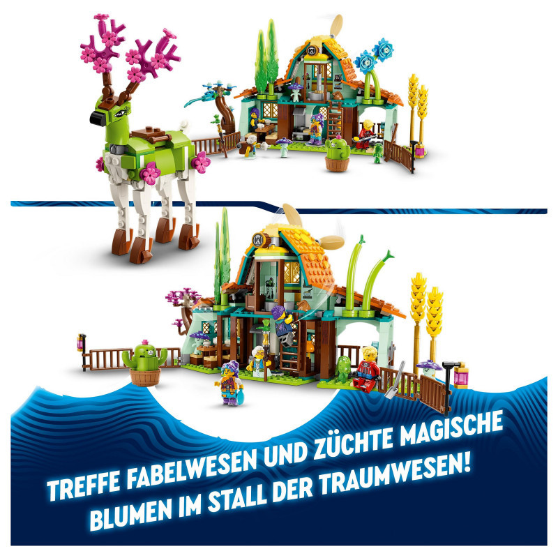 "LEGO DREAMZzz Stable of Dream Creatures. Product type: Building set, Recommended age (min): 8 yr(s), Material: Plastic, Number of pieces: 681 pc(s). Package weight: 945 g"\n"Kids aged 8+ can discover the whimsical Stable of Dream Creatures (71459) with this LEGO® DREAMZzz™ building toy set based on the TV show. Bursting with nature-inspired details and new friends, the set lets kids meet mythical creatures and nurture magical flowers. It’s full of awesome details that will help young imaginations bloom. Kids will delight in discovering the functional windmill, exploring the barn (which includes opening windows and gates) and getting acquainted with mythical new friends such as the 2 dreamlings.