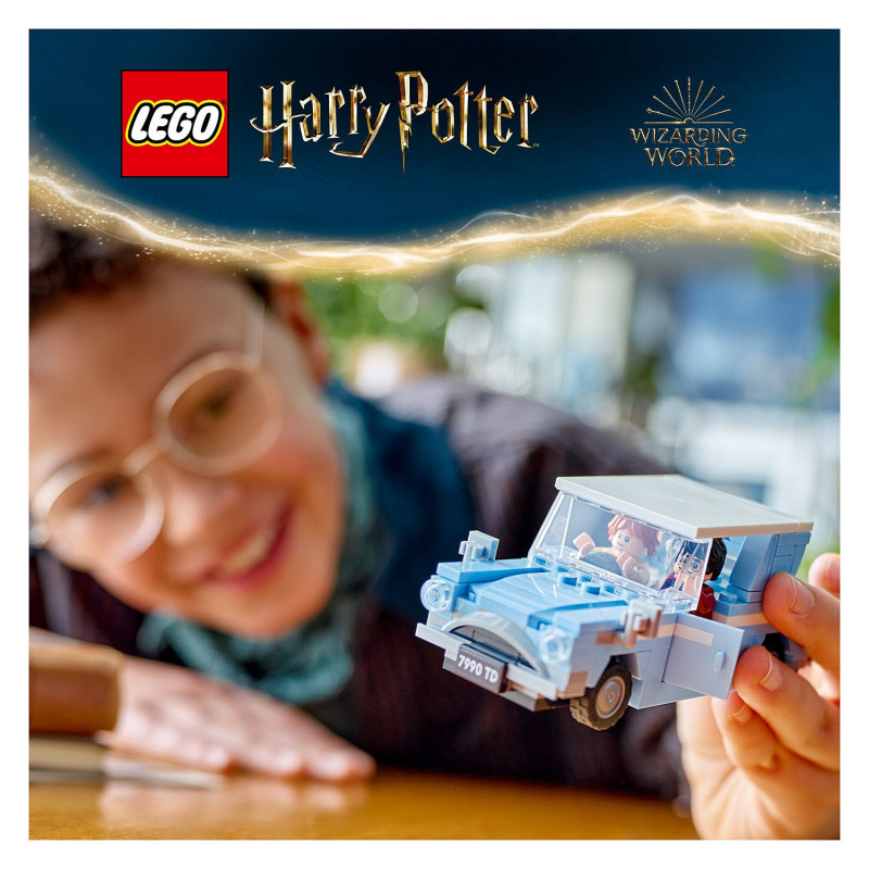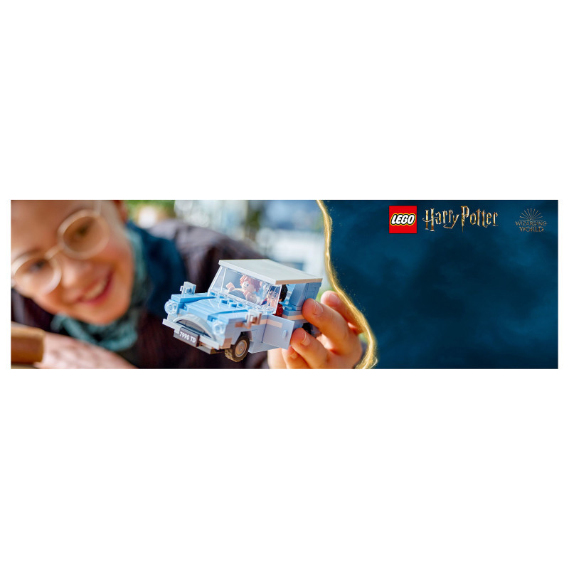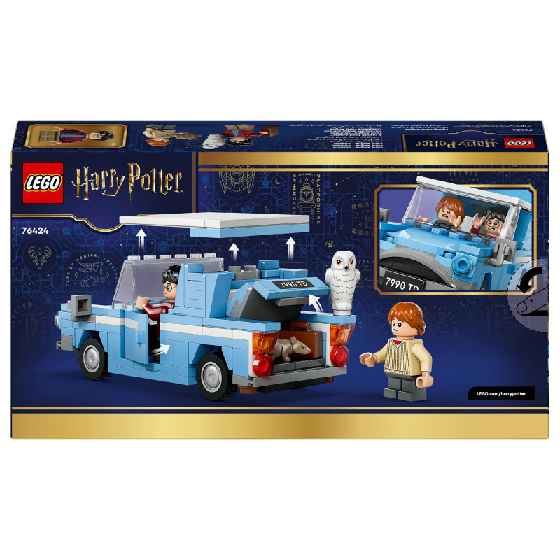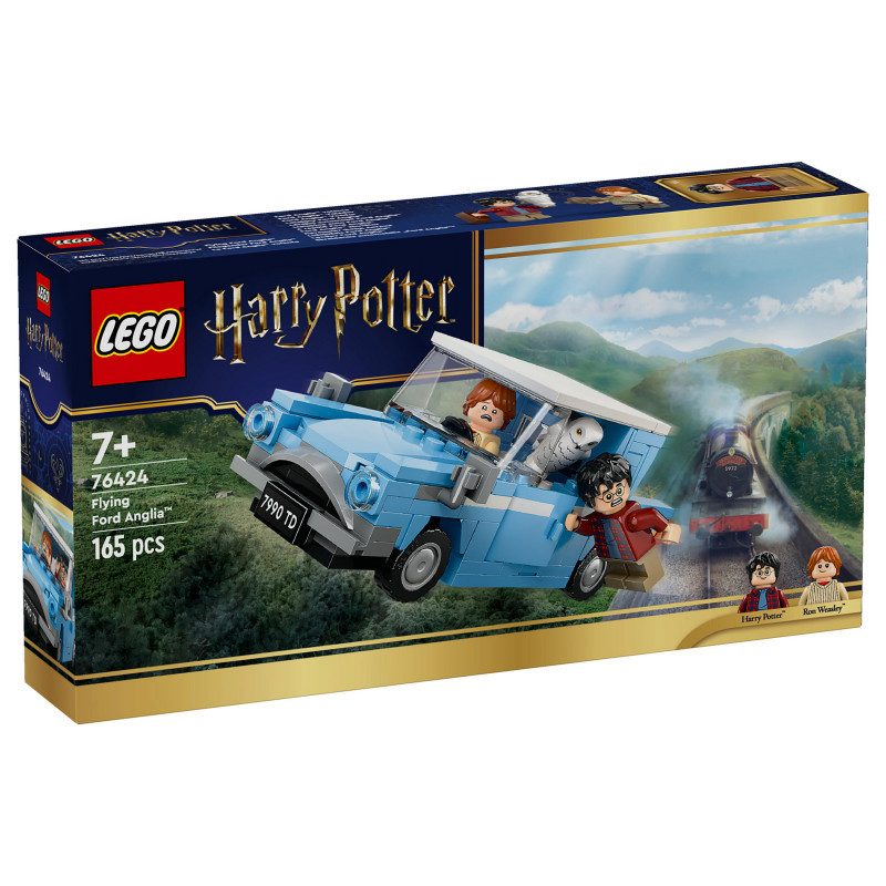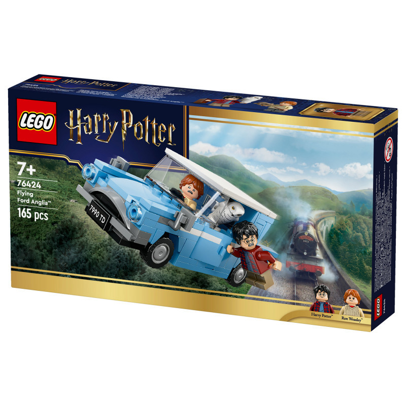 "LEGO Harry Potter Flying Ford Anglia™. Product type: Building set, Recommended age (min): 7 yr(s), Material: Plastic, Number of pieces: 165 pc(s). Package weight: 227 g"\n"Recreate Harry Potter™ and Ron Weasley’s thrilling journey to Hogwarts™ in the Flying Ford Anglia™ (76424) car with this fantasy toy playset for kids aged 7+. The LEGO® brick-built adventure toy car features opening doors and a removable roof so it’s easy to place the Harry Potter and Ron Weasley™ minifigures and Hedwig™ owl figure inside. There is also space in the boot for the suitcase, Harry and Ron’s wands and Ron’s pet rat, Scabbers™.