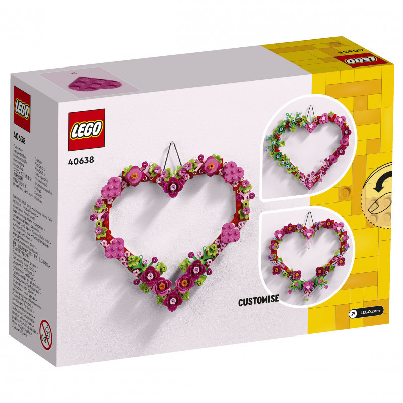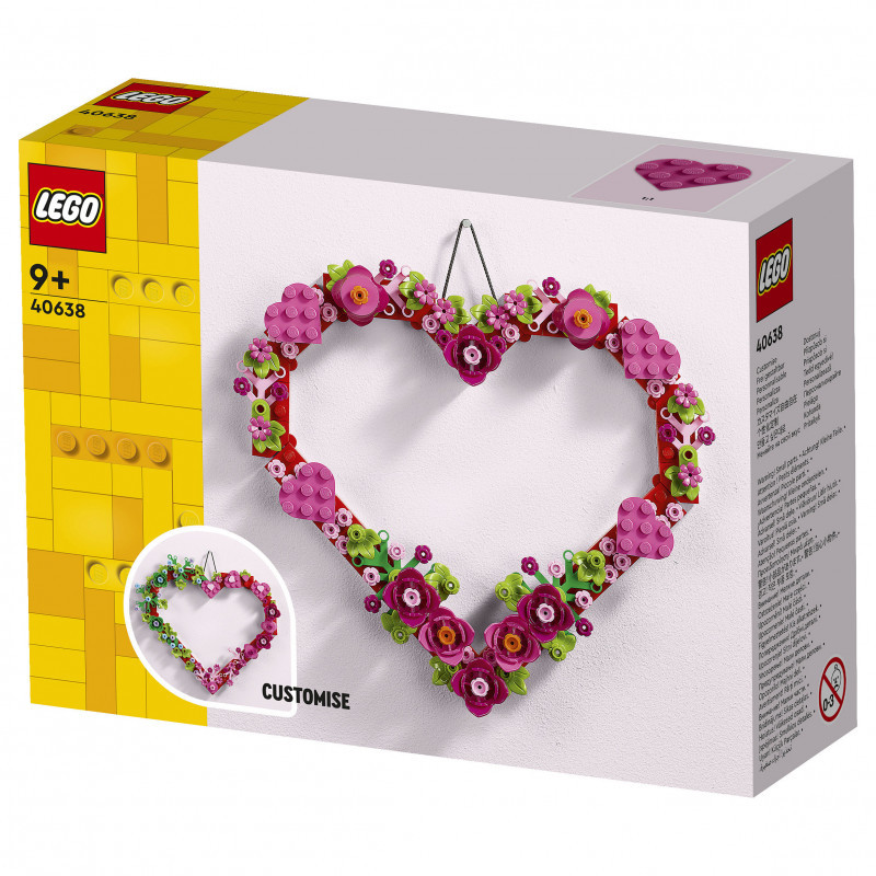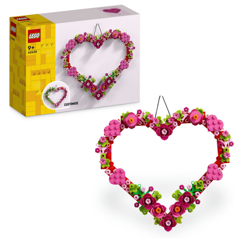 "LEGO Iconic Heart Ornament. Product type: Building set, Recommended age (min): 9 yr(s), Material: Plastic, Number of pieces: 254 pc(s). Package weight: 188 g"\n"Encourage kids’ creativity to blossom with this LEGO® Heart Ornament (40638) building set, which lets girls and boys aged 9 and over create a piece of home decor that they’ll cherish forever.