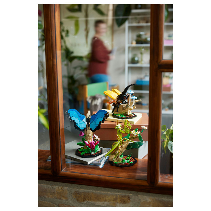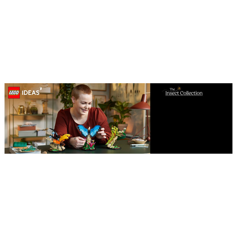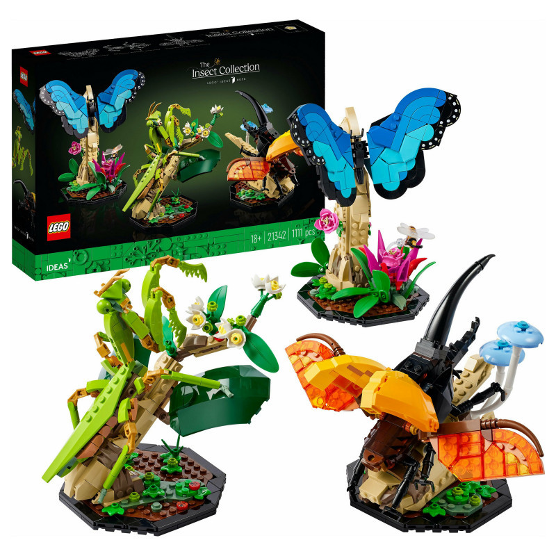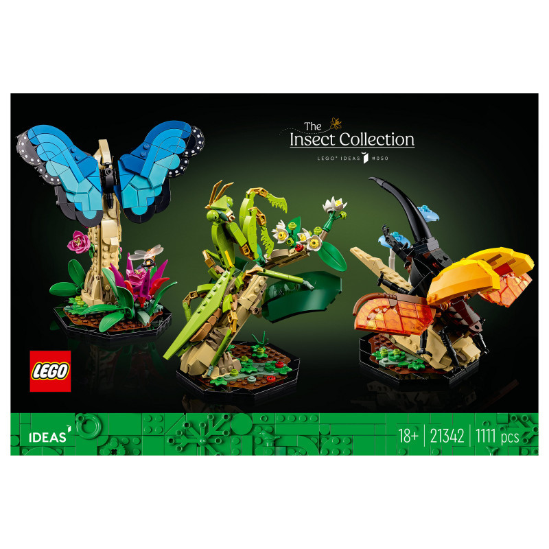 "LEGO Ideas The Insect Collection. Product type: Building set, Recommended age (min): 18 yr(s), Material: Plastic, Number of pieces: 1111 pc(s). Package weight: 1.1 kg"\n"Display spectacular insects from around the world in your home with the LEGO® Ideas The Insect Collection (21342). A charming gift idea for insect-lovers, this set features detailed, life-size, buildable models of a blue morpho butterfly, a Hercules beetle and a Chinese mantis in their natural habitats.
