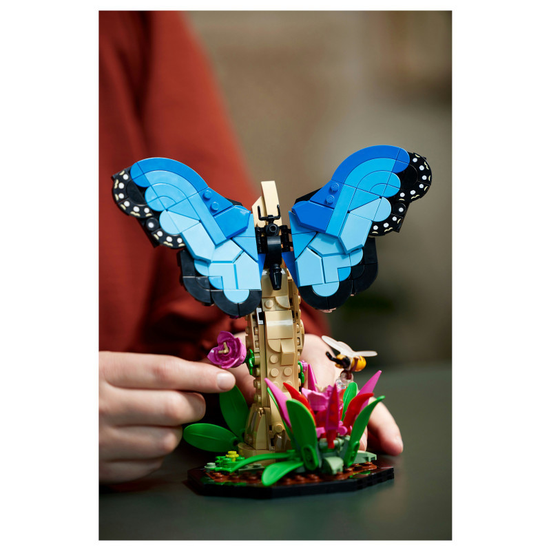 The blue morpho butterfly has adjustable wings featuring LEGO elements in different shades of blue and is displayed with a buildable flower and a honeybee. The Hercules beetle has attachable wings and the characteristic horns of the male of the species, while the fully posable female Chinese mantis (a species of praying mantis) comes with a 7-spot ladybird. Separate building instructions are included for each model, so you can build solo or with others.