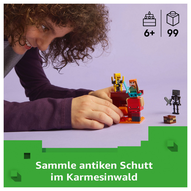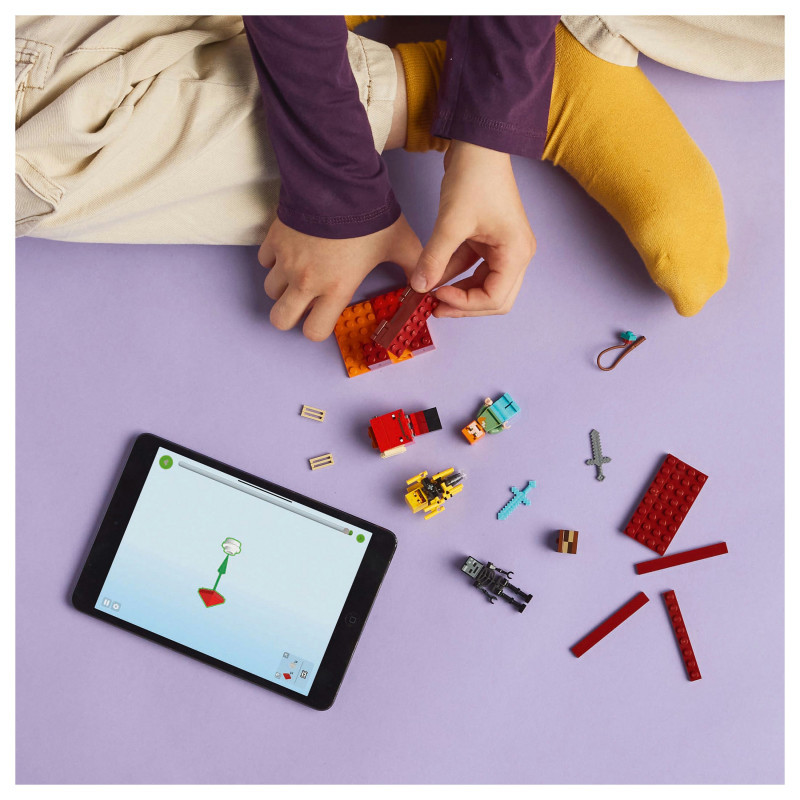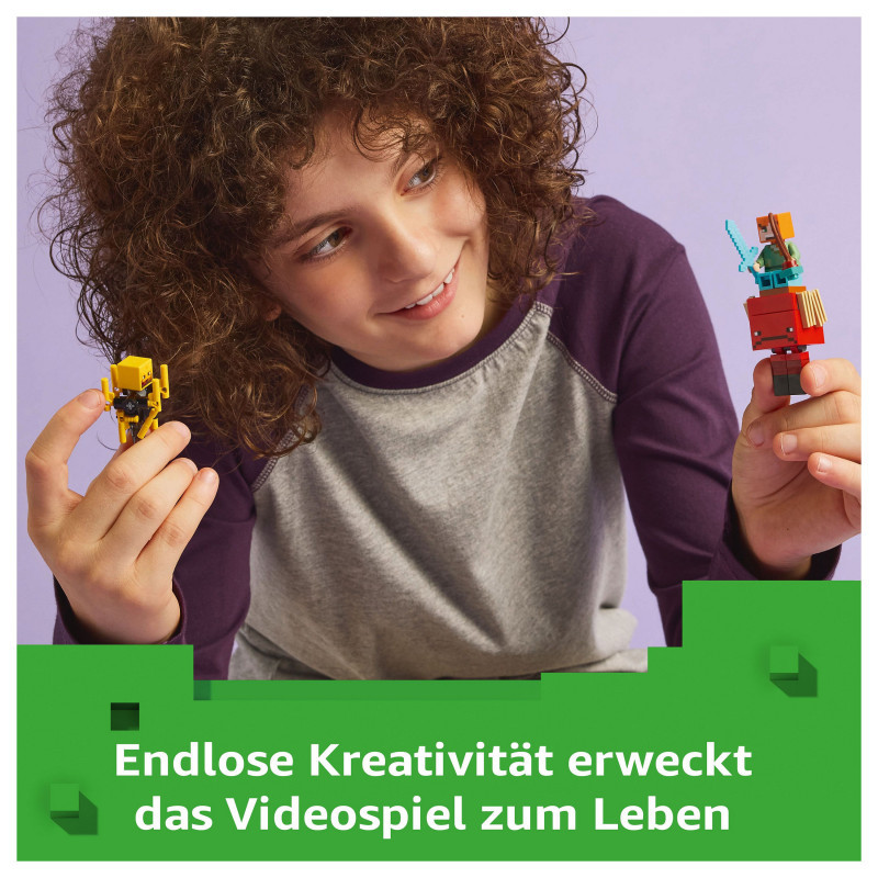 LEGO® Minecraft® Nether fortress action – Players will need their skills to collect ancient debris, escape a lava fall, battle mobs and ride a Minecraft figure to safety