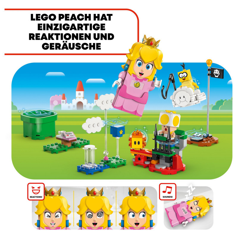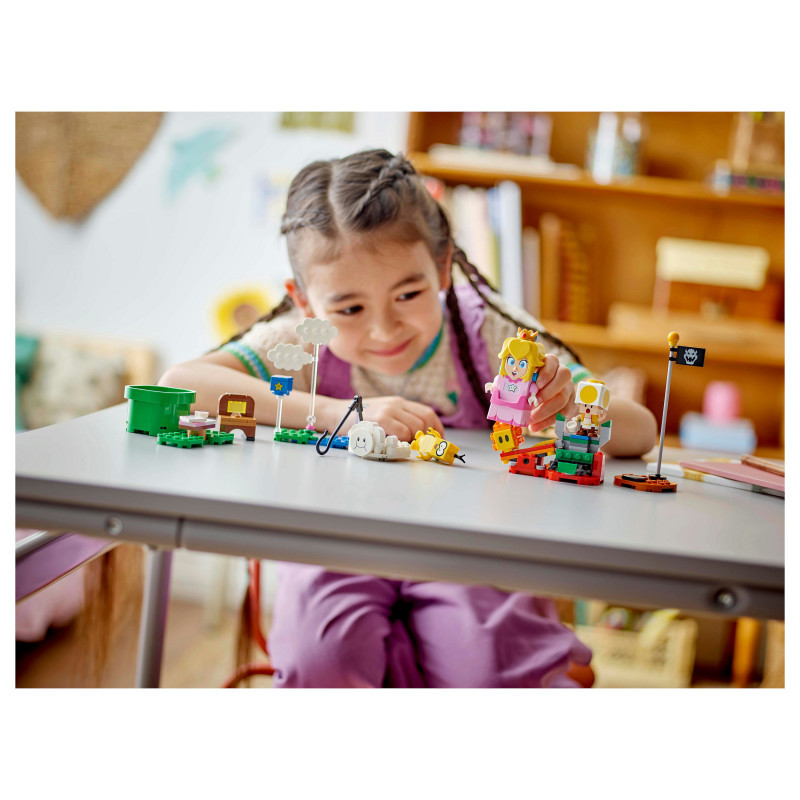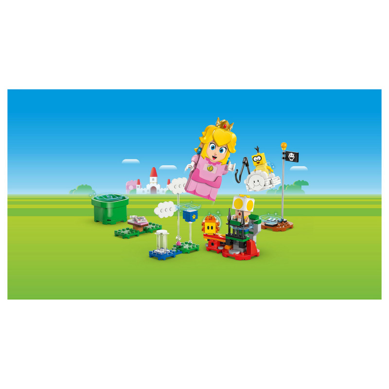 "LEGO Super Mario Adventures with Interactive ® Peach™. Product type: Building set, Recommended age (min): 6 yr(s), Material: Plastic, Number of pieces: 208 pc(s). Package weight: 447 g"\n"Join an iconic Super Mario™ character for a picnic and fly on a cloud to rescue the Yellow Toad with the Adventures with Interactive LEGO® Peach™ princess toy playset for kids (71441). A top Nintendo® gift for girls, boys and gamers aged 6 and over, the set features an interactive LEGO Peach figure, plus Lakitu, a Yellow Toad and a Lava Bubble. Travel from the Start Pipe to the Goal Pole triggering digital reactions from LEGO Peach and collecting coins along the way. Have a picnic, read a letter saying that the Yellow Toad has been captured, topple Lakitu from the cloud, and fly, flip and loop the loop on the cloud on the way to rescue the Yellow Toad. The buildable cloud toy also has a fishing pole for Lakitu to lift the Yellow Toad’s picnic seat.
