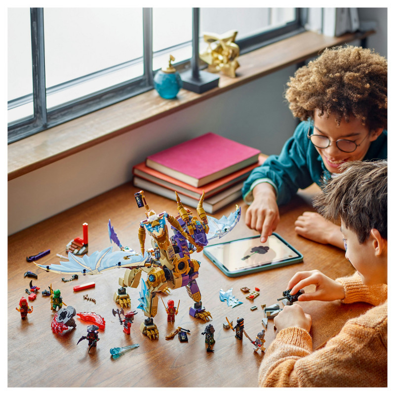 Interactive NINJAGO® dragon – Kids can activate a shooter in the dragon’s chest and move its large foil wings back and forth using a lever on its back