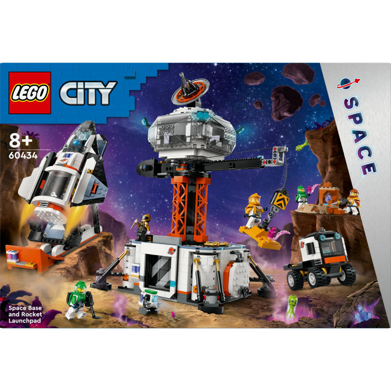 "LEGO Space Base and Rocket Launchpad. Product type: Building set, Recommended age (min): 8 yr(s), Material: Plastic, Number of pieces: 1422 pc(s). Package weight: 2.31 kg"\n"The 8+ LEGO® City Space Base and Rocket Launchpad (60434) space exploration toy is packed with features for out-of-this-world adventures. There’s a control room and 360° space crane tower above the main sector, which opens for access to an equipment carousel, science lab and refreshment area. The set also includes a spaceship, launchpad, construction vehicle and a planet scene with toy energy crystals and vegetation, plus 6 space crew minifigures and 1 robot and 2 alien figures for imaginative role play.