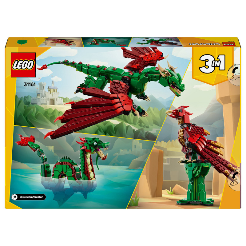 "LEGO Creator Medieval Dragon. Product type: Building set, Recommended age (min): 9 yr(s), Material: Plastic, Number of pieces: 715 pc(s). Package weight: 944 g"\n"Delight your little time traveller with this LEGO® Creator Medieval Dragon (31161) creature toy playset. Featuring a dragon figure that lets boys and girls aged 9 and over role-play thrilling medieval action, it has a pair of large posable wings that move up and down and fold in and out, as well as posable ankles, toes, neck, jaw, hips and shoulders. It also comes with a treasure chest for added play value.