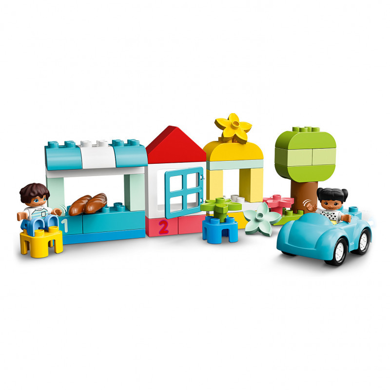 Inside the sturdy storage brick box, you’ll find a car with moving wheels, a roof, window, flowers, bread, DUPLO people figures, 1,2,3 numbered bricks… along with an assortment of original building bricks in a rainbow of inviting colours.