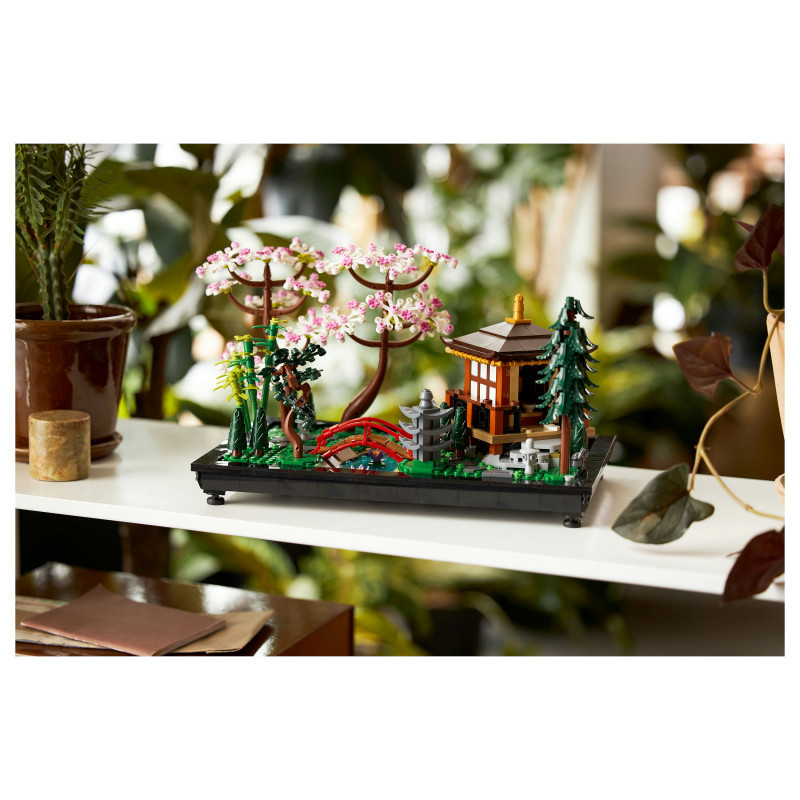 Based on a traditional Japanese garden, this buildable model includes an arched bridge, stream, koi carp, lotus flowers, trees, rocks, stone lanterns and a pavilion with a detailed tea-ceremony room.