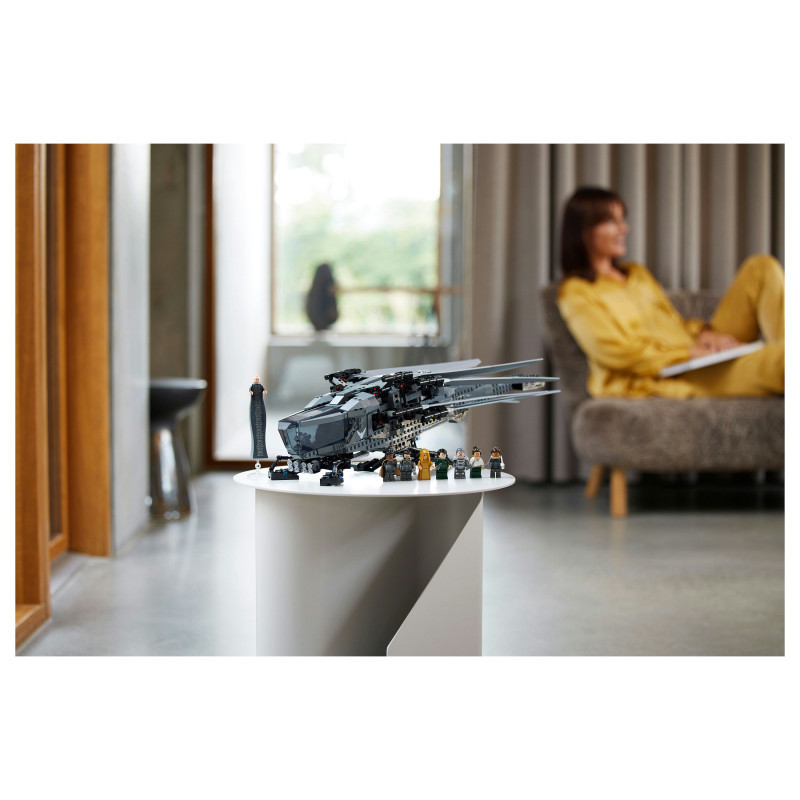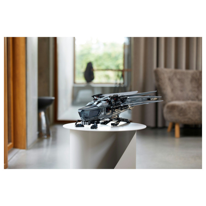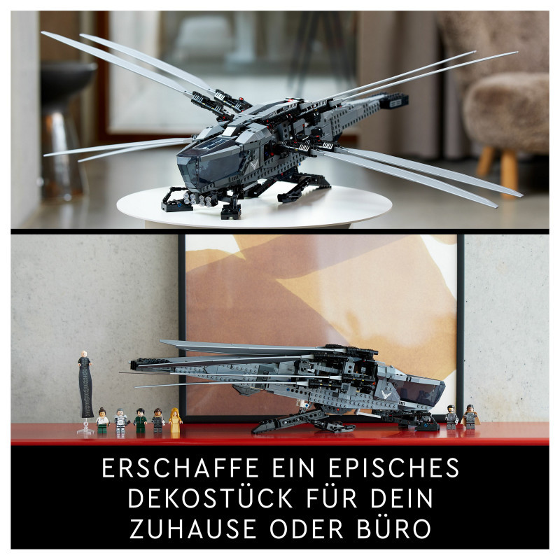 What’s in the box? – Everything you need to craft a LEGO® replica of the Dune Atreides Royal Ornithopter aircraft with fold-out, flappable wings and deployable landing gear, plus 8 film minifigures