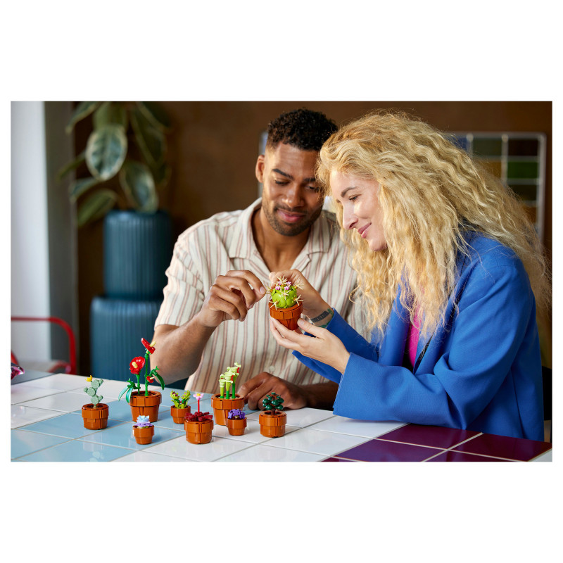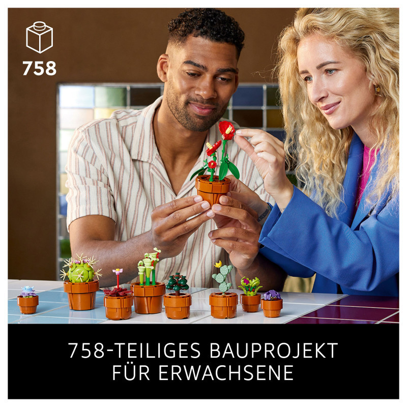 "LEGO Botanicals Tiny Plants. Product type: Building set, Recommended age (min): 18 yr(s), Material: Plastic, Number of pieces: 758 pc(s). Package weight: 707 g"\n"Create an elegant, zero-maintenance floral display with this home decor building set for adults. The LEGO® Botanicals Tiny Plants (10329) building project features flora based on arid, tropical and carnivorous species, each nestled in a buildable, terracotta-coloured container. Enjoy time out crafting each of the 9 plants before displaying them in your home or office.