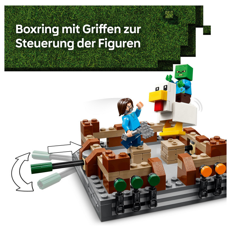 Minecraft® mansion toy – The set features a functional fighting ring with score-keepers in front of a mansion facade with a removable chest and weapons rack