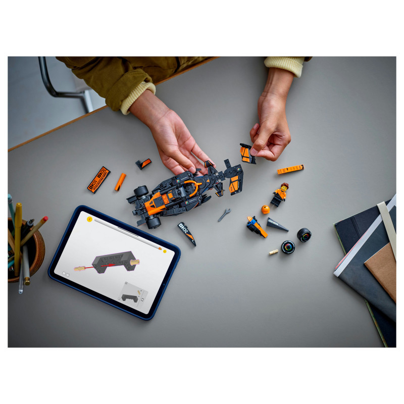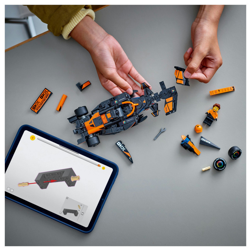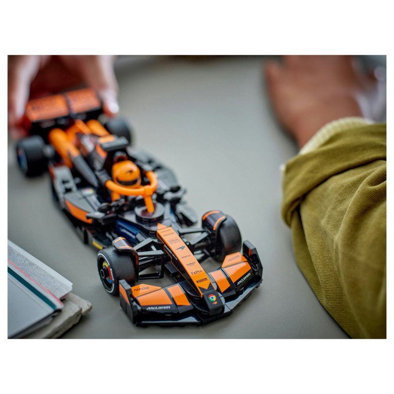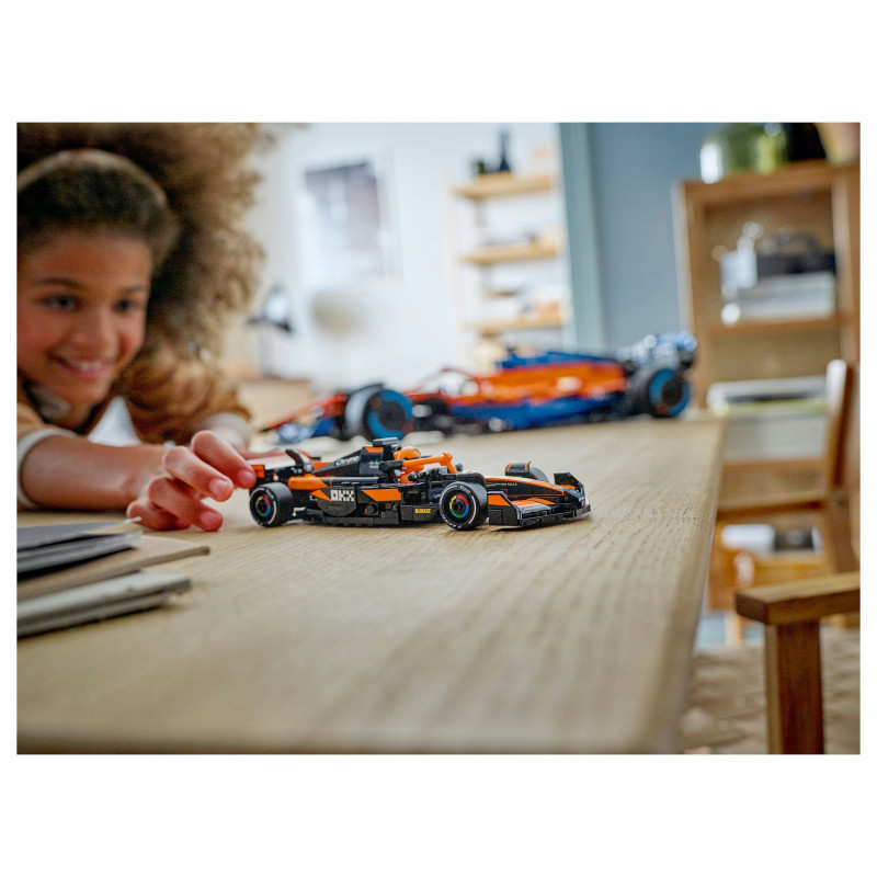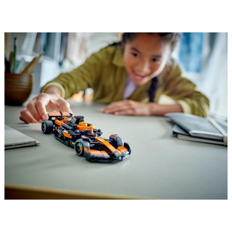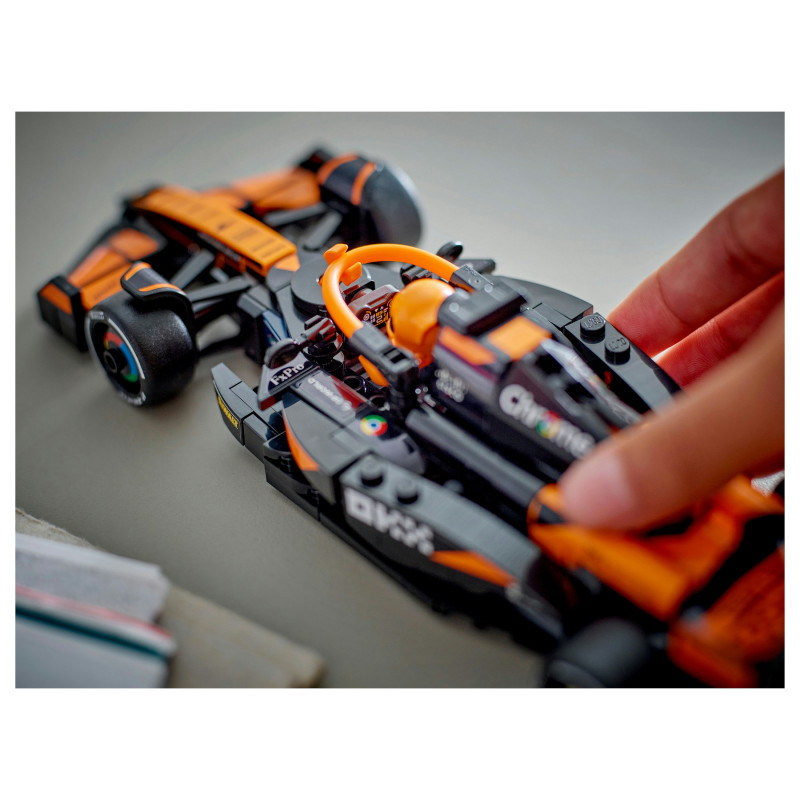 The F1 model car features a cockpit that opens by lifting the halo bar, a rear wing, wishbone suspension, sponsor stickers and wider rear tyres imprinted with “Pirelli”. The toy vehicle also comes with a driver minifigure wearing a McLaren outfit and a winged helmet to place inside the cockpit for racing action.
