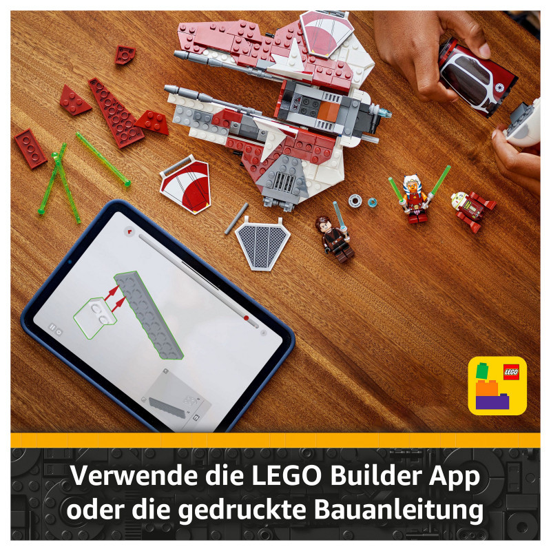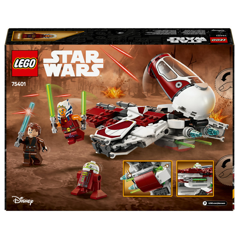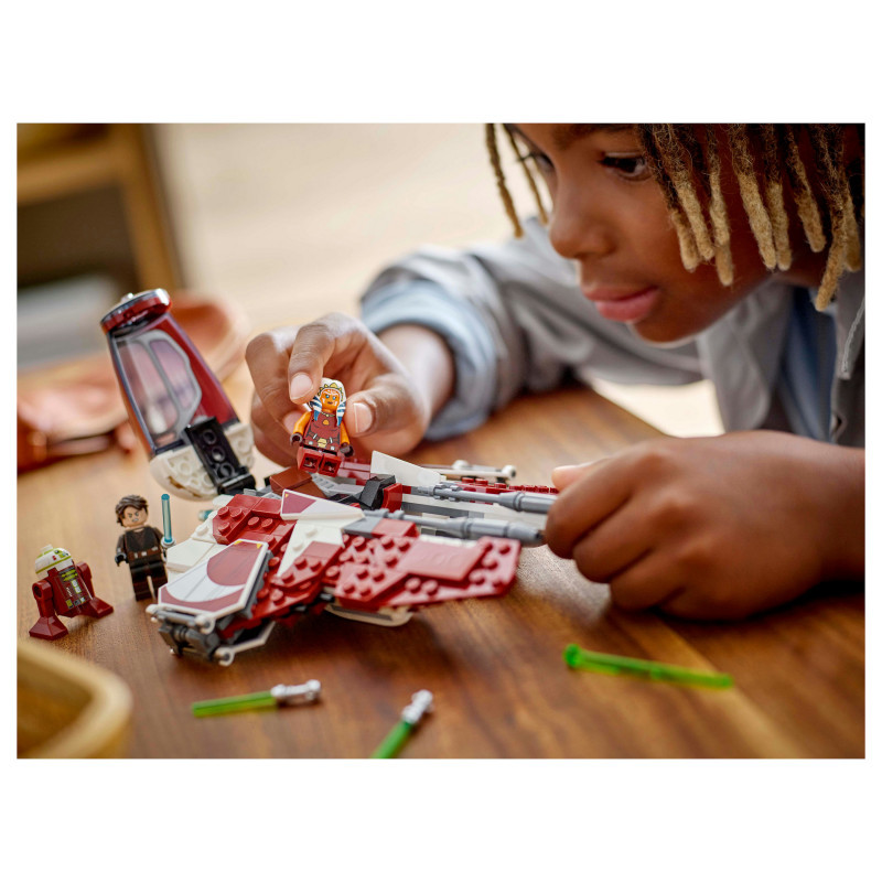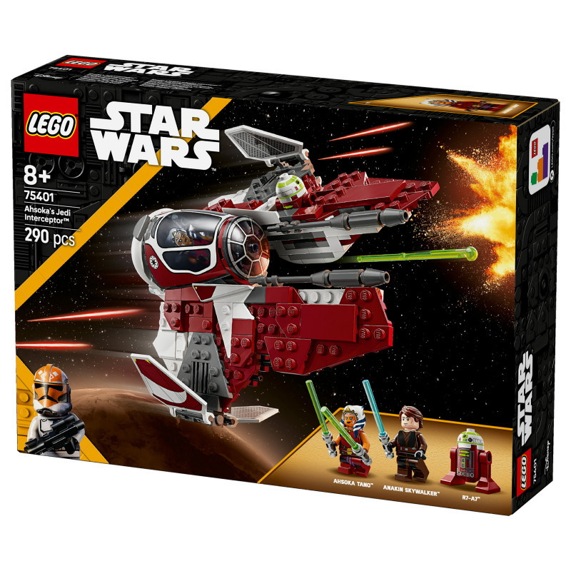 "LEGO Star Wars Ahsoka's Jedi Interceptor™. Product type: Building set, Recommended age (min): 8 yr(s), Material: Plastic, Number of pieces: 290 pc(s). Package weight: 448 g"\n"Let kids create their own exciting Star Wars: The Clone Wars™ adventures with Ahsoka’s Jedi Interceptor Starfighter Building Toy (75401). A cool LEGO® Star Wars™ gift idea for boys, girls and fans aged 8 and over, this brick-built Jedi Interceptor features an opening cockpit, adjustable wings for attack and cruise modes, and 2 spring-loaded shooters. The buildable playset includes 2 LEGO Star Wars minifigures – Ahsoka Tano and Anakin Skywalker with Lightsabers™ – plus an R7-A7 LEGO droid figure for fantasy play. Ahsoka can be placed in the Jedi Interceptor’s cockpit, and there’s room on board for R7-A7 and storage for Ahsoka’s Lightsabers™.