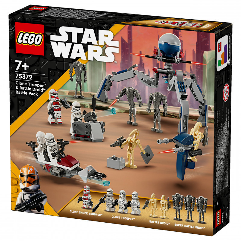 "LEGO Star Wars Clone Trooper™ & Battle Droid™ Battle Pack. Product type: Building set, Recommended age (min): 7 yr(s), Material: Plastic, Number of pieces: 215 pc(s). Package weight: 227 g"\n"Inspire youngsters to recreate thrilling Star Wars: The Clone Wars scenes with this LEGO® Star Wars™ Clone Trooper & Battle Droid Battle Pack (75372) for ages 7 and over. It features 4 LEGO Star Wars minifigures and 5 LEGO figures – a Clone Shock Trooper, 3 Clone Troopers, 3 Super Battle Droids and 2 Battle Droids – with iconic weapons for action play. This LEGO building set also includes a stud-shooting Star Wars speeder bike for 2 Clone Troopers and a buildable STAP speeder vehicle toy for a Battle Droid. A tri-droid with 3 flick shooters and a defensive post with a stud shooter add even more creative-play possibilities.