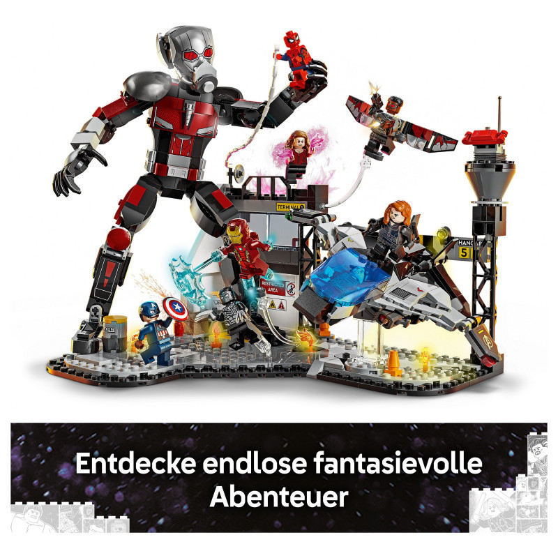 LEGO® Marvel figures – Includes a large, fully jointed Ant-Man LEGO figure and 8 minifigures: Captain America, Winter Soldier, Wanda, Falcon, Iron Man, Spider-Man, Black Widow and Black Panther