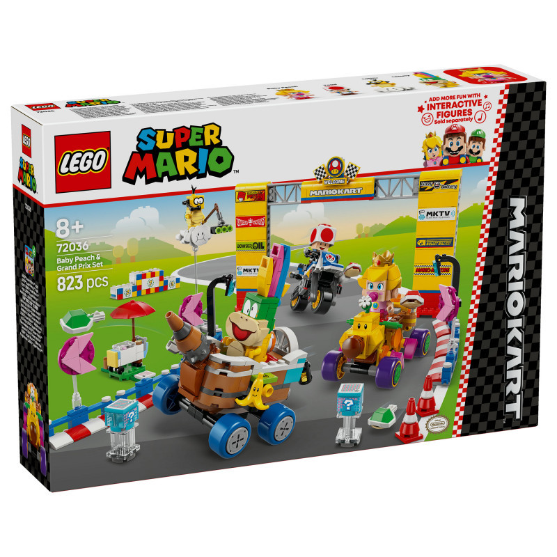 "LEGO Super Mario Mario Kart™ – Baby Peach & Grand Prix Set. Product type: Building set, Recommended age (min): 8 yr(s), Material: Plastic, Number of pieces: 823 pc(s). Package weight: 1.02 kg"\n"Ready, steady, build! Let kids create their own Mario Kart™ track and vehicles, race to victory and role-play as iconic characters with this LEGO® Super Mario™: Mario Kart: Baby Peach & Grand Prix Set (72036). An awesome Nintendo® character gift idea for boys, girls and gamers aged 8 and over, this customisable racing toy playset features Wild Wiggler, Landship and Standard Bike vehicles that can launch shells, a starting gate, track barriers, traffic cones, a winners’ podium, Toad’s sweets wagon and Lakitu’s cloud.