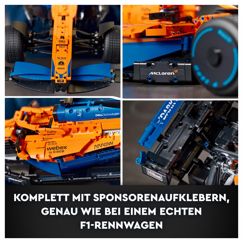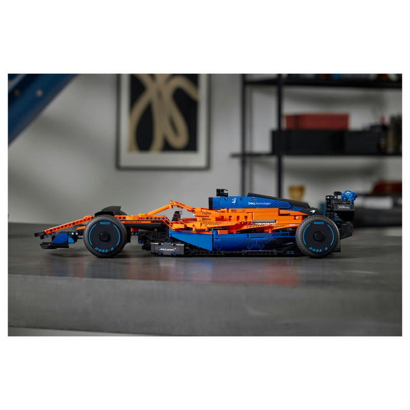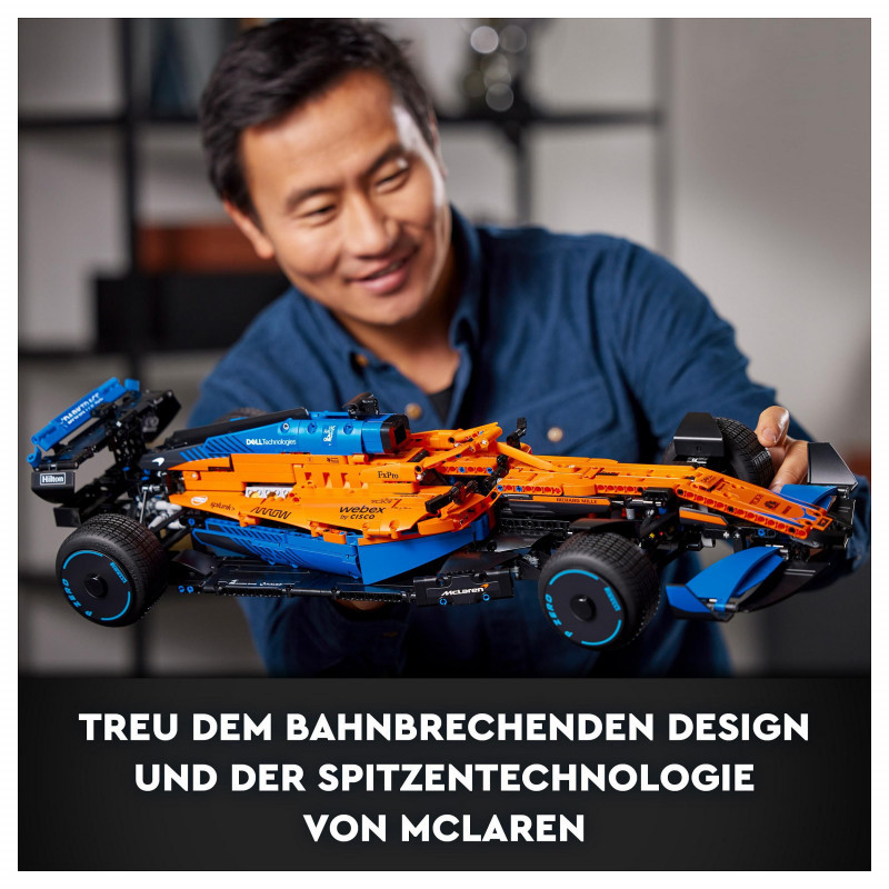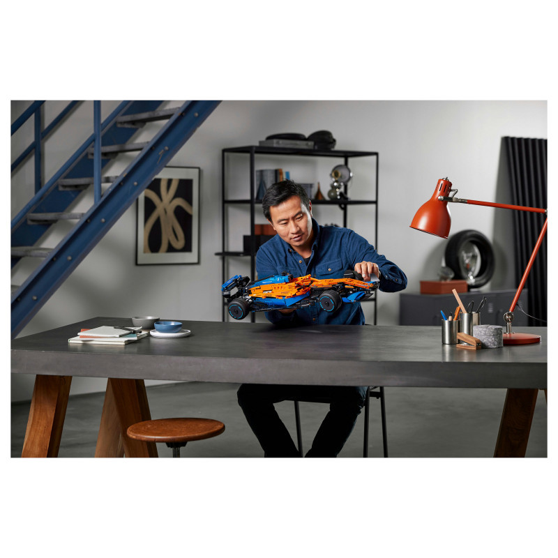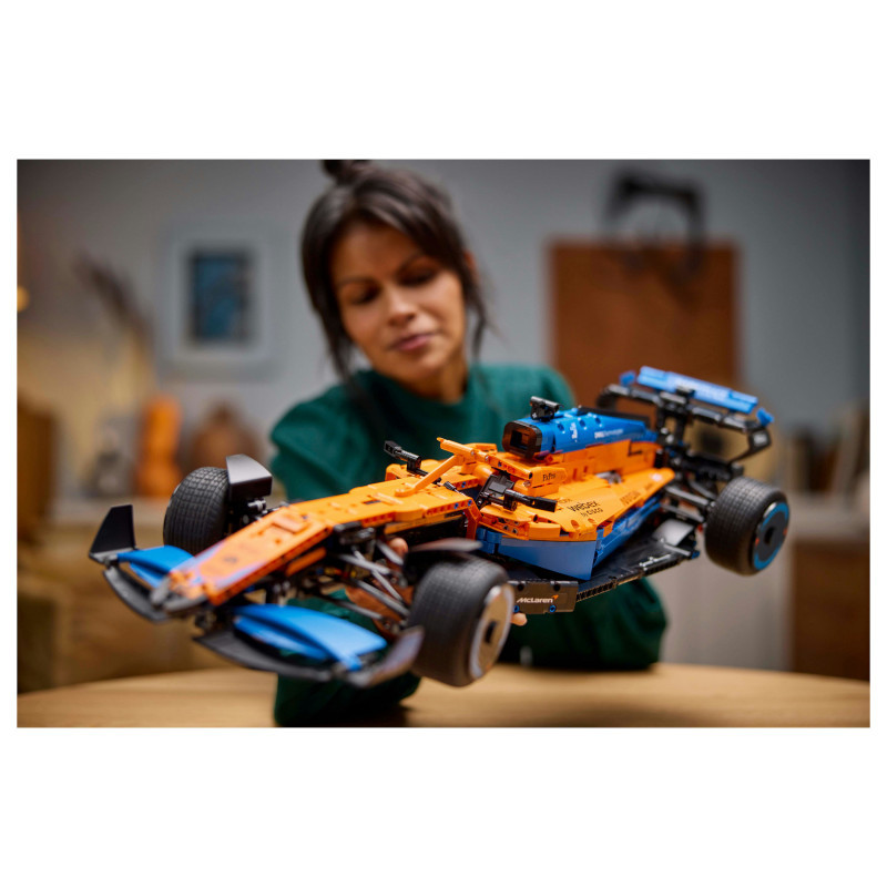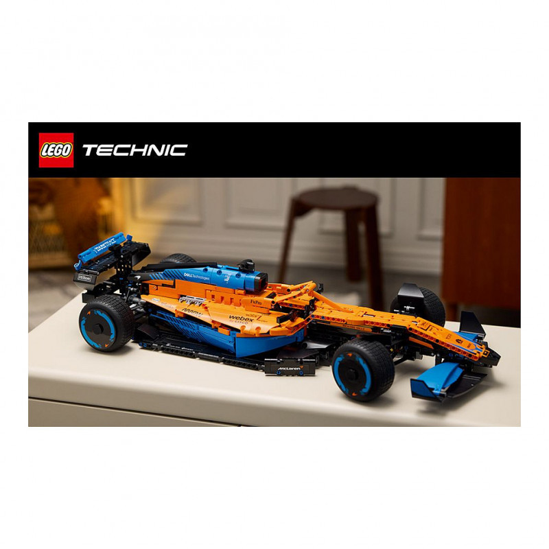 "LEGO Technic McLaren Formula 1™ Race Car. Product type: Building set, Recommended age (min): 18 yr(s), Material: Plastic, Number of pieces: 1434 pc(s). Package weight: 2.27 kg"\n"Remove all distractions. Channel your competitor's focus. It’s time to build a highly detailed LEGO® Technic McLaren Formula 1™ Race Car 42141 model. When you cross the finish line, you’ll feel immense pride – with an impressive display model to celebrate your dedication.