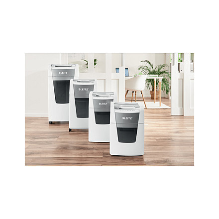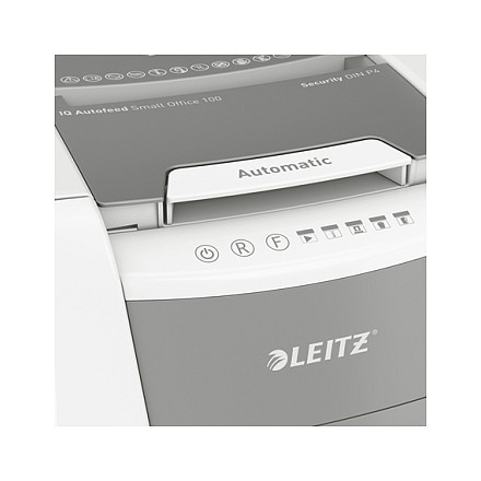 "Leitz IQ Autofeed Small Office 100 Automatic Paper Shredder P4. Shredding type: Cross shredding, Working width: 22 cm, Shredding size: 4 x 30 mm. Power consumption (typical): 300 W. Width: 365 mm, Depth: 430 mm, Height: 530 mm. Warranty period: 2 year(s)"\n"Fully automatic paper shredder from Leitz with unique clean emptying feature. So intelligent it quietly works on its own, just insert your stack of papers (incl. staples & paper clips), close the lid and get on with your day. Ideal for small office use. Confidential security and excellent performance with this anti jam, quiet and long running (20 min) autofeed shredder. Automatically shred 100 sheets of A4 into security P4 (4x30mm) cross cut pieces in one go into the generous 34L bin. Simple operation using touch controls."