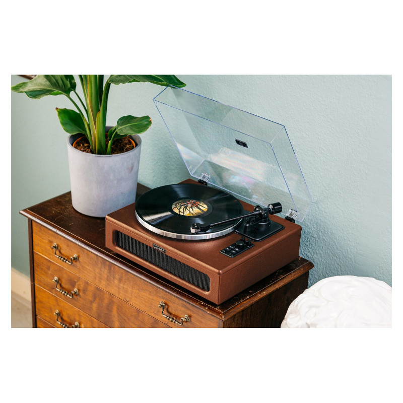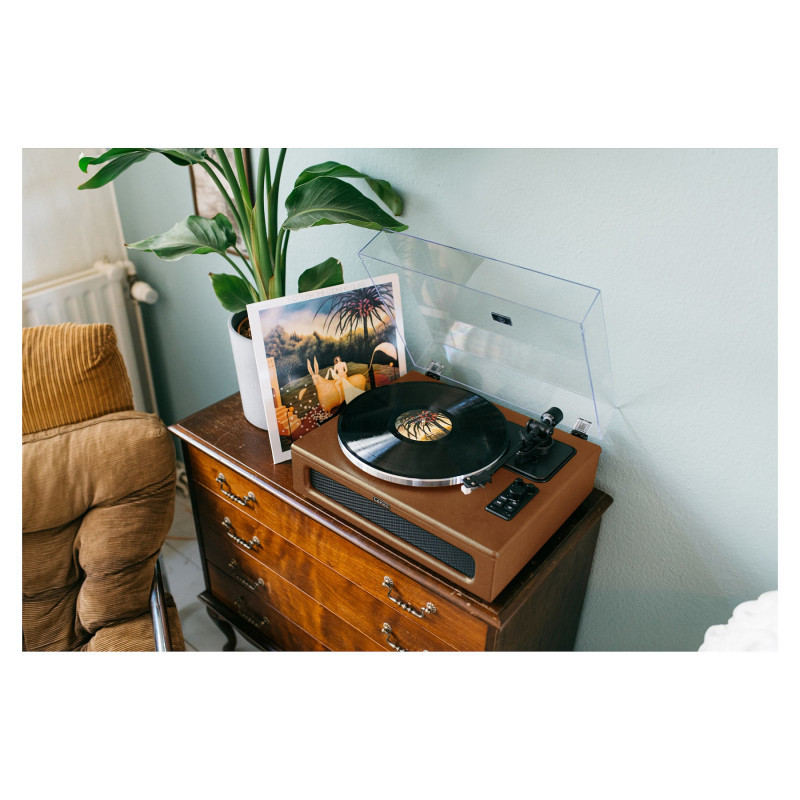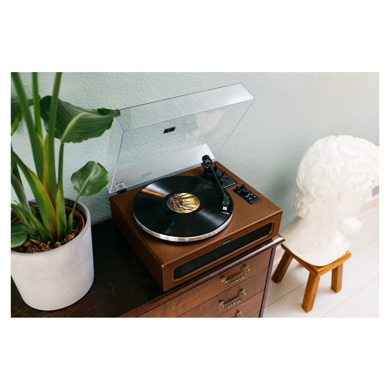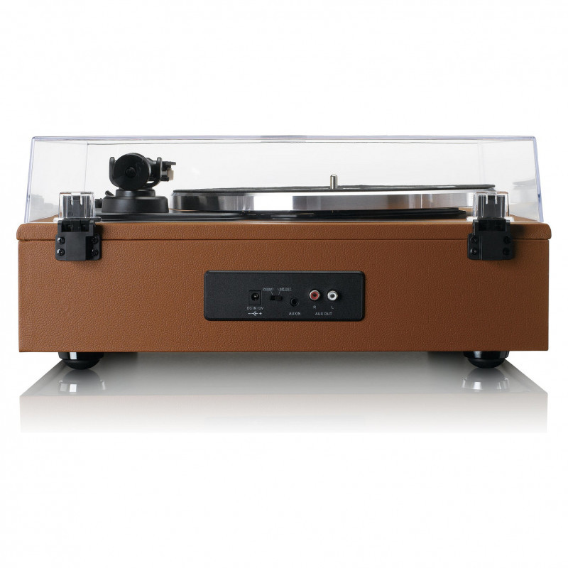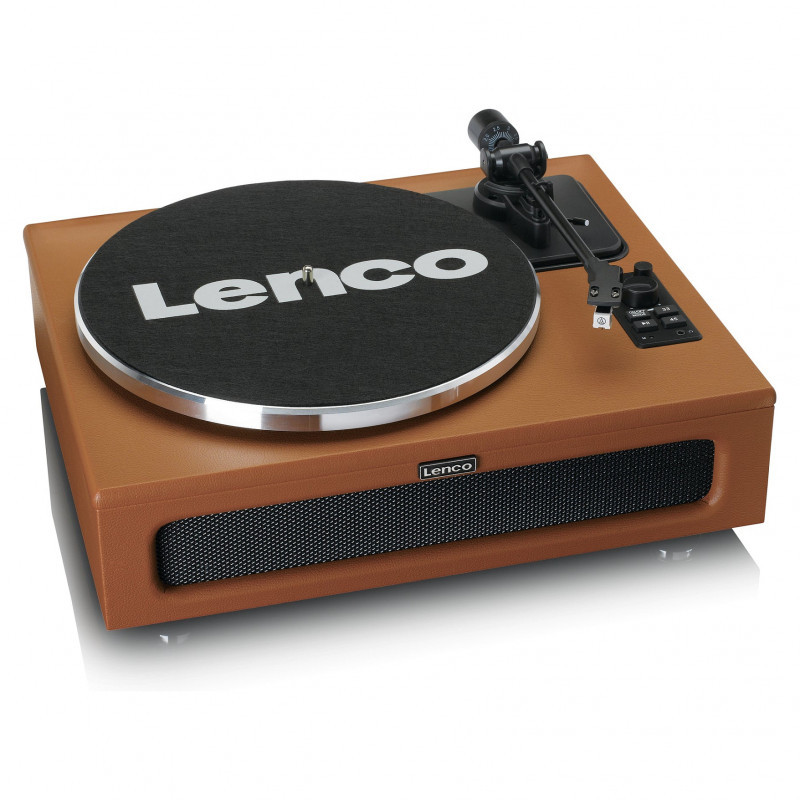 "Lenco LS-430BN. Type: Belt-drive audio turntable, Operation: Manual, Product colour: Brown. Tracking force range: 3 - 4 g. Bluetooth range: 10 m, Headphone connectivity: 3.5 mm. RMS rated power: 50 W, Impedance: 47000 Ω, Frequency range: 20 - 20000 Hz. Power supply type: AC, Power consumption (typical): 18 W, Power consumption (standby): 0.1 W"\n"The Lenco LS-430 is a turntable with built-in speakers. The four speakers (two 15 Watt speakers and two 10 Watt speakers) provide a nicely balanced sound. The turntable is easy to use. Simply plug it in and instantly enjoy your favourite LP! Alternatively, stream your playlist on your smartphone or tablet using Bluetooth 5.0 to connect to the turntable’s speakers. If you want to retreat and relax with your favourite music, simply plug in headphones.