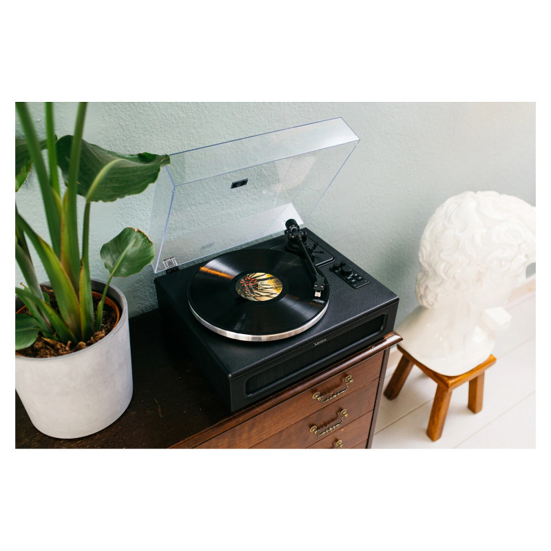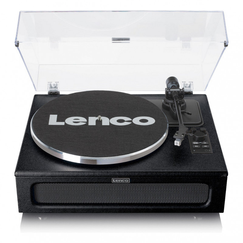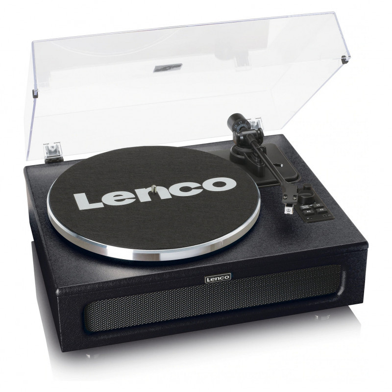 "Lenco LS-430BK. Type: Belt-drive audio turntable, Product colour: Black, Housing material: Faux leather, Metal, Plastic. Bluetooth range: 10 m. RMS rated power: 40 W. Power supply type: AC, AC adapter input voltage: 100 - 240 V, AC adapter frequency: 50 - 60 Hz. Width: 425 mm, Depth: 370 mm, Height: 192 mm"\n"The Lenco LS-430 is a turntable with built-in speakers. The four speakers (two 15 Watt speakers and two 10 Watt speakers) provide a nicely balanced sound. The turntable is easy to use. Simply plug it in and instantly enjoy your favourite LP! Alternatively, stream your playlist on your smartphone or tablet using Bluetooth® 5.0 to connect to the turntable’s speakers. If you want to retreat and relax with your favourite music, simply plug in headphones.