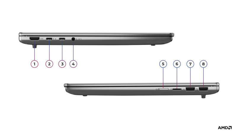 1x USB-A (USB 5Gbps/USB 3.2 Gen 1); 1x USB-A (USB 5Gbps/USB 3.2 Gen 1), Always On; 2x USB-C (USB 5Gbps/USB 3.2 Gen 1), with USB PD 3.0 and DisplayPort 1.4; 1x Headphone/microphone combo jack (3.5mm); 1x microSD card reader |