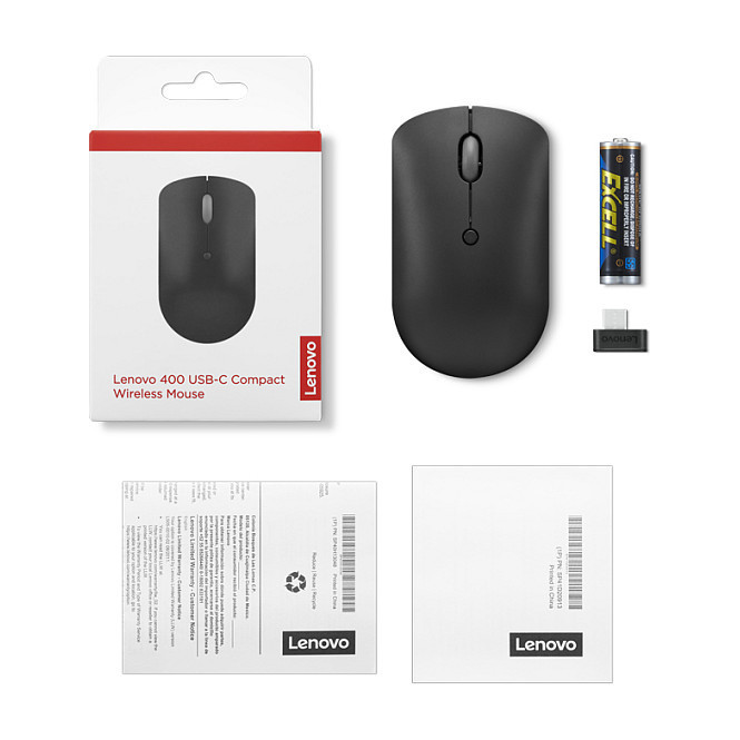 "Lenovo 400. Form factor: Ambidextrous. Movement detection technology: Optical, Device interface: RF Wireless, Movement resolution: 2400 DPI, Buttons type: Pressed buttons, Buttons quantity: 4, Scroll type: Wheel. Power source: Batteries. Product colour: Black"\n"With its compact, portable form, the Lenovo 400 USB-C Compact Wireless Mouse is perfect for your on-the-go lifestyle. Its convenient wireless USB-C receiver provides stable plug-and-play connectivity, while enabling you to pair your ultrabook with up to eight devices. Thanks to its red optical sensor and up to 2400 on-the-fly DPI adjustment, precision and accuracy is guaranteed whether you are working on a small or big screen."