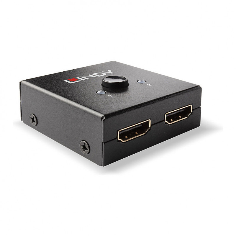 "Lindy 2 Port HDMI 18G Bi-Directional Switch. Video port type: HDMI. Material: Metal, Product colour: Black, Maximum refresh rate: 60 Hz. Certification: CE, FCC, REACH, California Proposition 65. Width: 49 mm, Depth: 52 mm, Height: 20 mm. Package width: 63.5 mm, Package depth: 80 mm, Package height: 28 mm"\n"The Lindy HDMI 18G Bi-directional Switch allows the user to connect two 4K Ultra High Definition source devices such as Blu-Ray players or games consoles to a single 4K Ultra HD display or projector and easily switch between them at the push of a button. Alternatively, connect one 4K Ultra HD source can be connected to two 4K Ultra HD displays or projectors and switch between displays at the touch of a button.