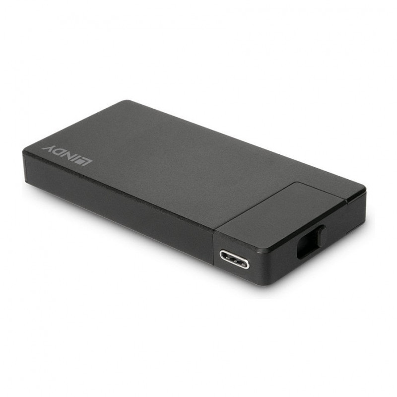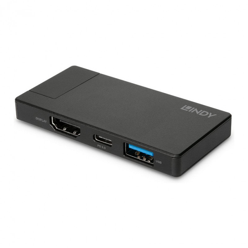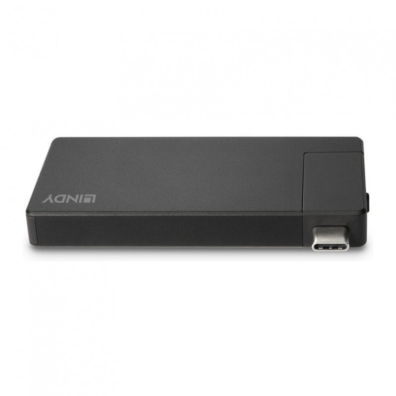 "Lindy DST-Micro, USB-C Laptop Micro Docking Station with 4K Support and 100W Pass-Through Charging. Connectivity technology: Wired, Host interface: USB 3.2 Gen 1 (3.1 Gen 1) Type-C, USB Power Delivery up to: 60 W. Product colour: Black, Maximum digital resolution: 3840 x 2160 pixels, Housing material: Aluminium. Power source type: USB, Output voltage: 20 V, Output current: 3 A. Width: 75 mm, Depth: 38 mm, Height: 8.5 mm. Quantity per pack: 1 pc(s), Package width: 174 mm, Package depth: 194 mm"\n"The DST-Micro is a lightweight travel docking station, unlocking greater connectivity for your device, on the go. Part of Lindy's expert range of Laptop Docking Stations, this product has been designed to make travelling with your tech easy and stress-free.