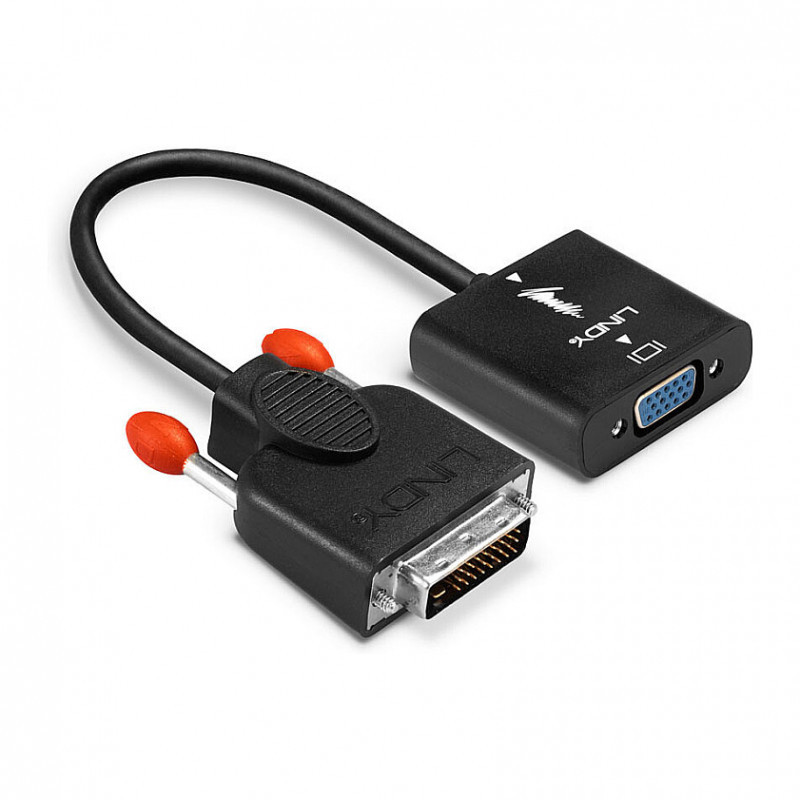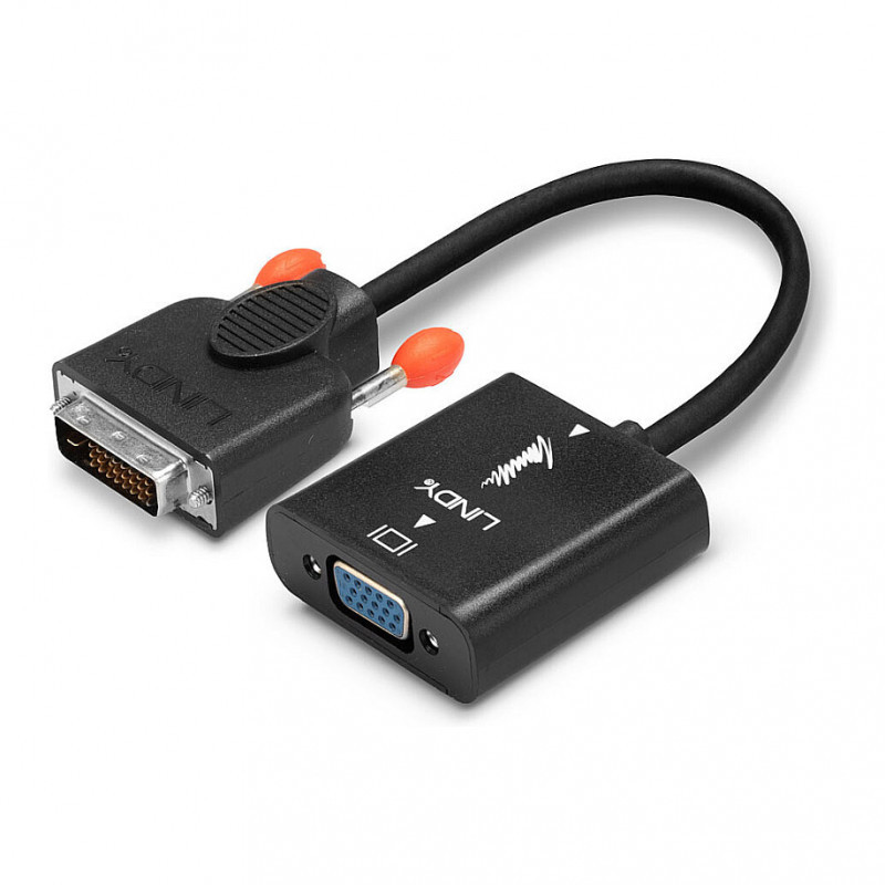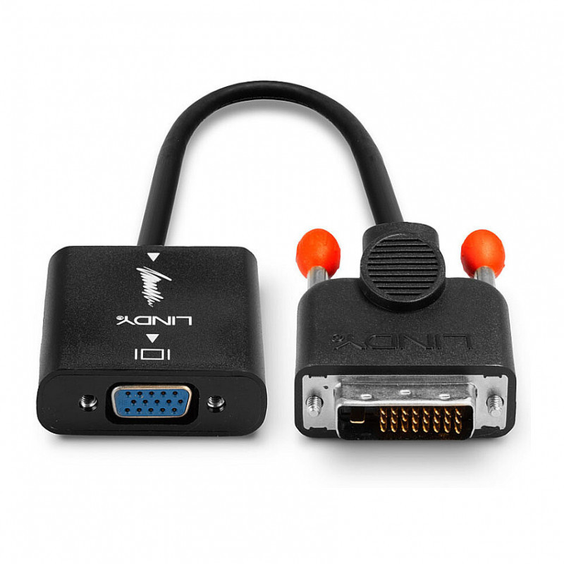 "Lindy DVI-D to VGA Converter. Cable length: 0.1 m, Connector 1: DVI-D, Connector 2: VGA (D-Sub). Certification: CE, UKCA, FCC, RoHS, REACH. Cable diameter: 5.5 mm, Connector 1 dimensions (WxDxH): 40 x 52.25 x 16.5 mm, Connector 2 dimensions (WxDxH): 44 x 45 x 15 mm. Package width: 160 mm, Package depth: 160 mm, Package height: 20 mm. Quantity per pack: 1 pc(s)"\n"The Lindy DVI to VGA converter converts signals from a DVI-D equipped source into a VGA signal. It supports resolutions up to 1080p and 1920x1200 for VGA displays. This allows the connection of DVI capable devices, such as PC's, notebooks and ultrabooks, to an older VGA display or projector.