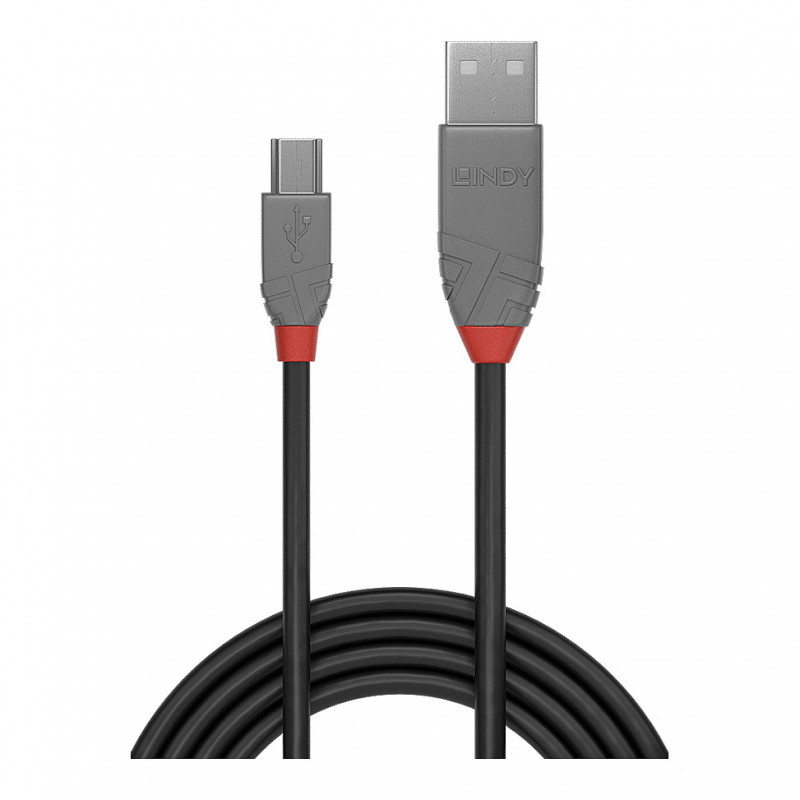 "Lindy 5m USB 2.0 Type A to Mini-B Cable, Anthra Line. Cable length: 5 m. Connector 1: USB A, Connector 2: Mini-USB B, USB version: USB 2.0, Maximum data transfer rate: 0.48 Gbit/s, Connector contacts plating: Gold, Product colour: Black"\n"From the Lines cable connectivity concept developed by Lindy, Anthra Line USB 2.0 Type A to Mini-B cables are the professional choice for high performance connections in commercial AV and IT installations.