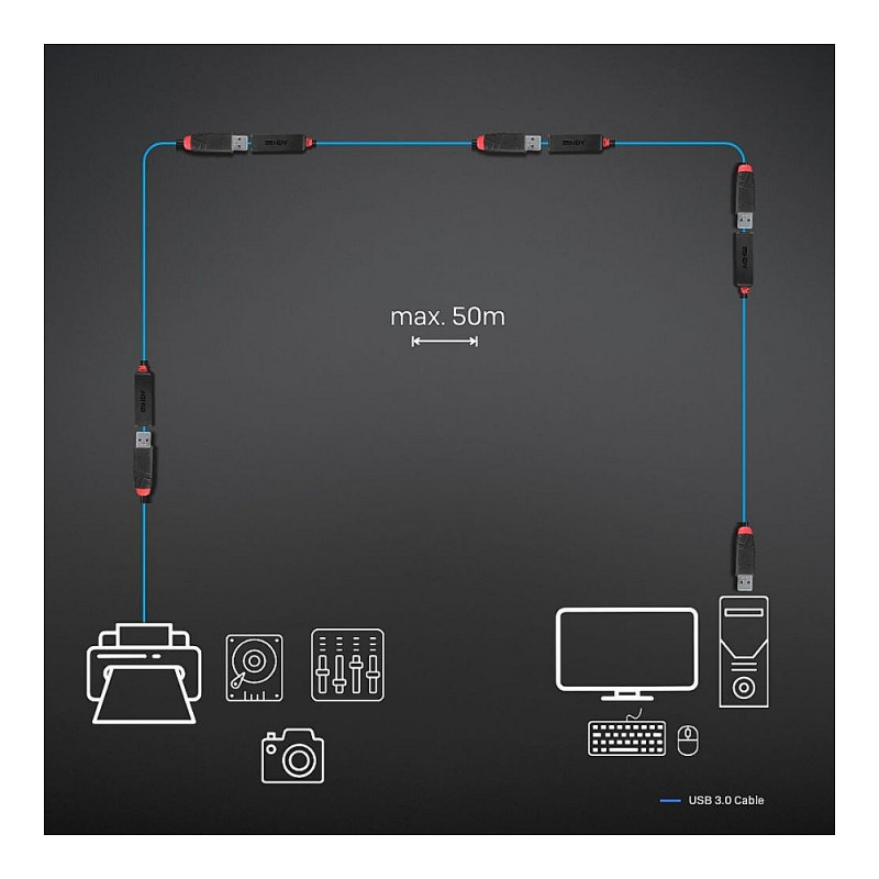 Up to 5 of these USB 3.0 Active Extensions Slim can be chained together. In addition, a maximum of 5 of the different cable lengths of these USB 3.0 Active Extensions Slim can be combined with each other. The only exception is the 15m version No. 43404: as it has 2 chipsets, a maximum of 3 other USB 3.0 Active Extensions Slim can be combined with it.