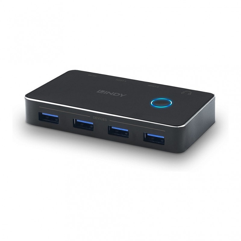 "Lindy 43387. Maximum data transfer rate: 5 Gbit/s, Power connector: USB Type-C, Product colour: Black. Operating voltage: 5 V. Width: 100 mm, Depth: 50 mm, Height: 16.4 mm. Cables included: USB. Package depth: 154 mm, Package width: 112 mm, Package height: 40 mm"\n"The Lindy USB 3.0 Sharing Switch 2:4 allows up to 2 users to share up to 4 USB 3.0 peripheral devices without the need to repeatedly swap cables or set up complicated network sharing software. The active computer port can be selected by push button. The switch is ideal for sharing a printer, storage device or webcam in office environments. It also allows to share a conference room presentation system like Barco Clickshare between two users. The USB 3.0 Sharing Switch features a 3.5mm Audio output port for connecting speakers or headphones.