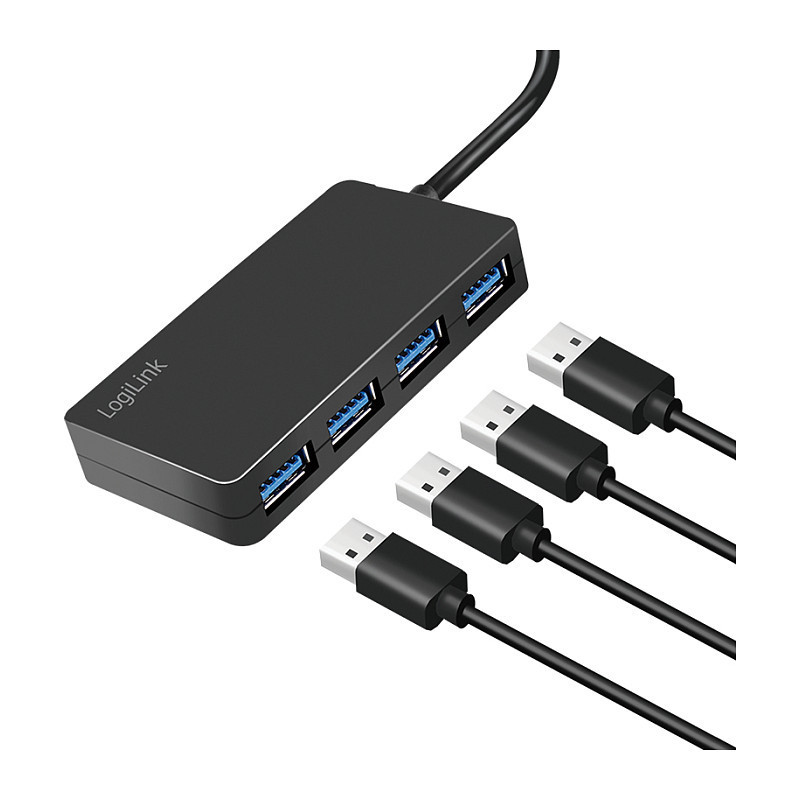 "LogiLink USB 3.2 Gen1, 4-port hub, black. Host interface: USB 3.2 Gen 1 (3.1 Gen 1) Type-A, Hub interfaces: USB 3.2 Gen 1 (3.1 Gen 1) Type-A. Data transfer rate: 5000 Mbit/s, Product colour: Black, Housing material: Acrylonitrile butadiene styrene (ABS). Power supply type: USB, Power supply: 4.5 W, Input voltage: 5 V. Windows operating systems supported: Windows 10, Windows 11, Windows 7, Windows 8, Windows 8.1, Mac operating systems supported: MacOS, Other operating systems supported: Android, ChromeOS. Width: 257 mm, Depth: 42 mm, Height: 12 mm"\n"The hub supports the modern USB 3.2 Gen1 standard and allows you to connect up to 4 USB devices (4x USB 3.2 Gen1 ports). Of course, you can also connect and use devices of older USB generations. Easy connection via plug & play. USB 3.2 transfer rates of up to 5 Gbit/s."