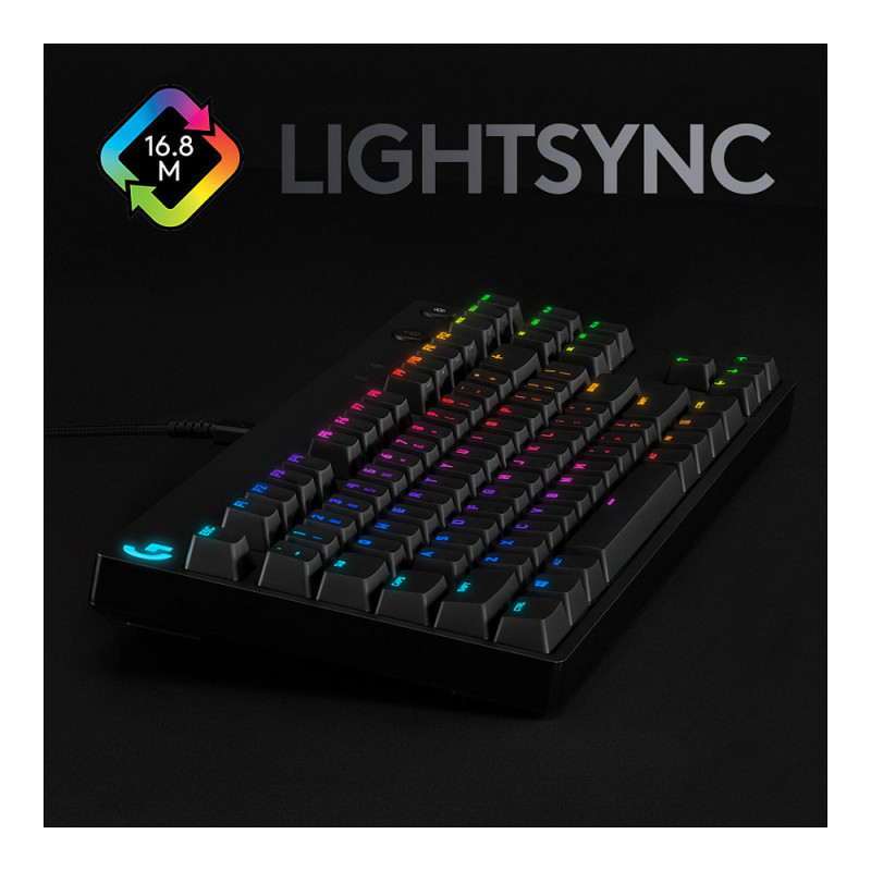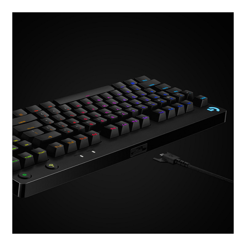 "Logitech G G PRO Mechanical Gaming Keyboard. Keyboard form factor: Tenkeyless (80 - 87%). Keyboard style: Straight. Connectivity technology: Wired, Device interface: USB, Keyboard key switch: Mechanical, Keyboard layout: QWERTZ. Backlight type: RGB LED. Cable length: 1.8 m. Recommended usage: Gaming. Product colour: Black"\n