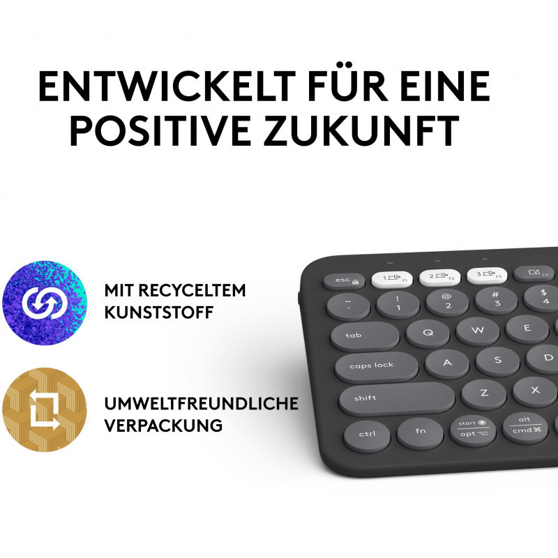 "Logitech Pebble Keys 2 K380s. Keyboard form factor: Mini. Keyboard style: Straight. Connectivity technology: Wireless, Device interface: Bluetooth, Keyboard key switch: Scissor key switch, Keyboard layout: QWERTZ, Recommended usage: Universal. Product colour: Graphite"\n