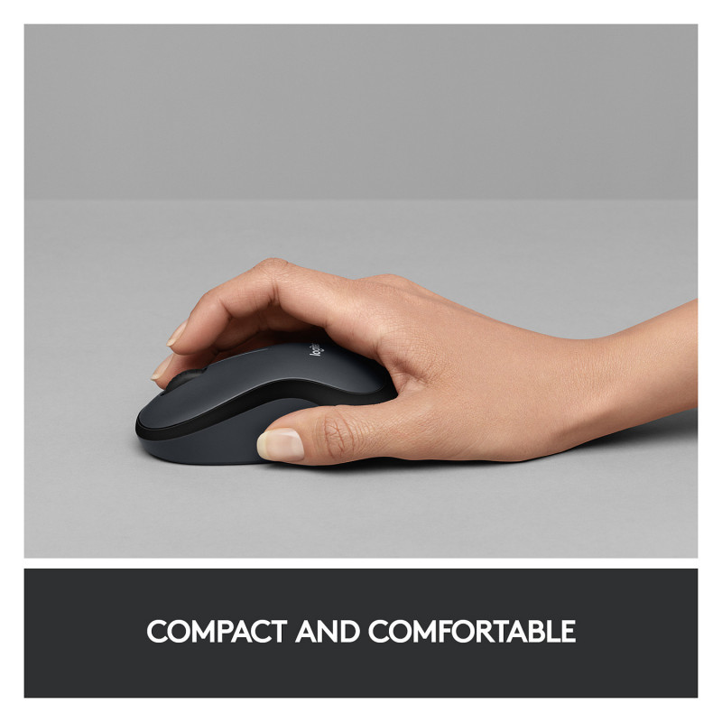 "Logitech M220 SILENT. Form factor: Ambidextrous. Movement detection technology: Optical, Device interface: RF Wireless, Movement resolution: 1000 DPI, Buttons type: Pressed buttons, Buttons quantity: 3, Scroll type: Wheel. Power source: Batteries. Product colour: Charcoal"\n"With the same click feel and 90% noise reduction* compared to classic mice, M220 SILENT offers a quiet experience for yourself and those around you. It has a long-lasting 18-month battery life with auto-sleep and a powerful 10-metre wireless range** with 128-bit encryption between the mouse and the receiver. Plus, its small size is perfect to toss in a bag and go. Just plug the tiny USB receiver and it works with Windows®, Mac, ChromeOS™ or Linux®. Finally, the Logitech® Advanced Optical Tracking is designed for smooth and precise moves on almost any surface.