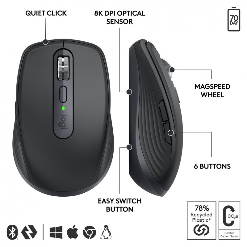 "Logitech MX Anywhere 3S for Business. Form factor: Right-hand. Movement detection technology: Laser, Device interface: RF Wireless + Bluetooth, Movement resolution: 8000 DPI, Buttons type: Pressed buttons, Buttons quantity: 6, Scroll type: Wheel. Power source: Batteries. Product colour: Graphite"\n